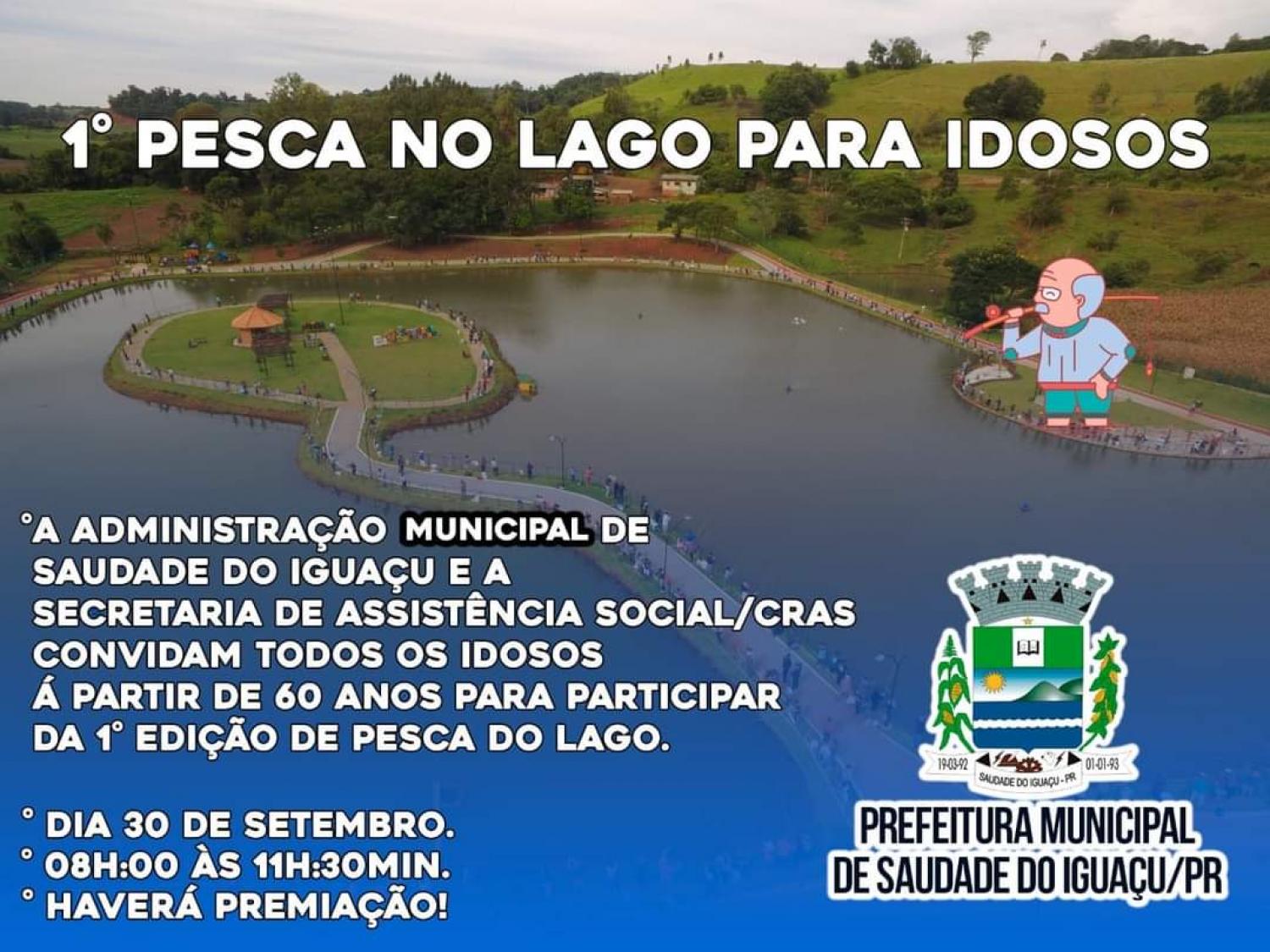 Para iniciar as comemorações do dia Internacional Do Idoso a administração municipal de Saudade do Iguaçu, juntamente com a Secretária de Assistência Social (CRAS) convidam a todos os idosos de Saudade Do Iguaçu com idade acima de 60 anos, para participar da 1° Edição do Pesca no Lago Para Idosos.