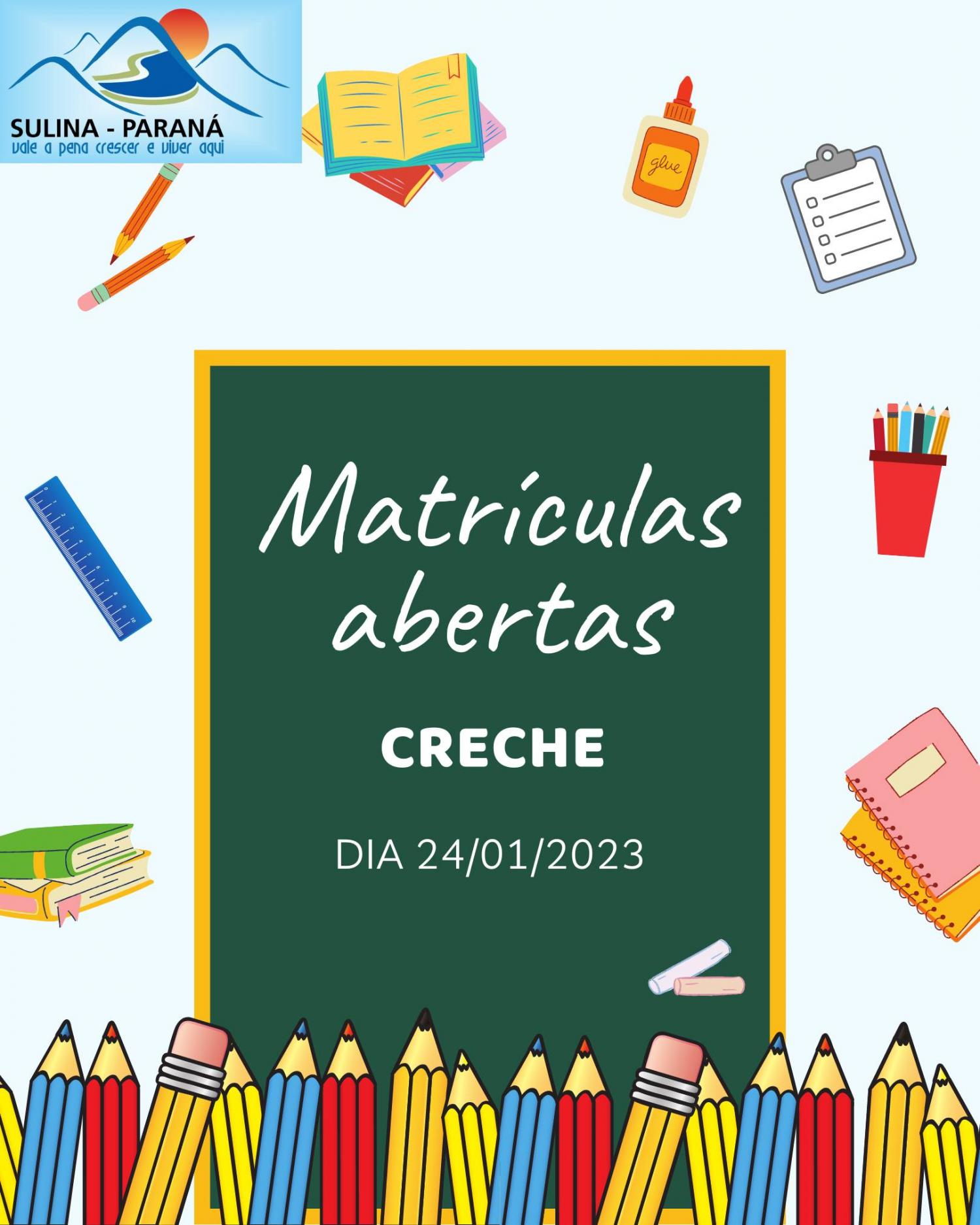 A Administração Municipal de Sulina, através da Secretaria de Promoção Social, juntamente da Secretaria de Educação, confirmaram na manhã de hoje que a partir do dia 24 de janeiro de 2023 estarão abertas as matrículas para crianças de 2 a 4 anos para frequentar a creche no município.