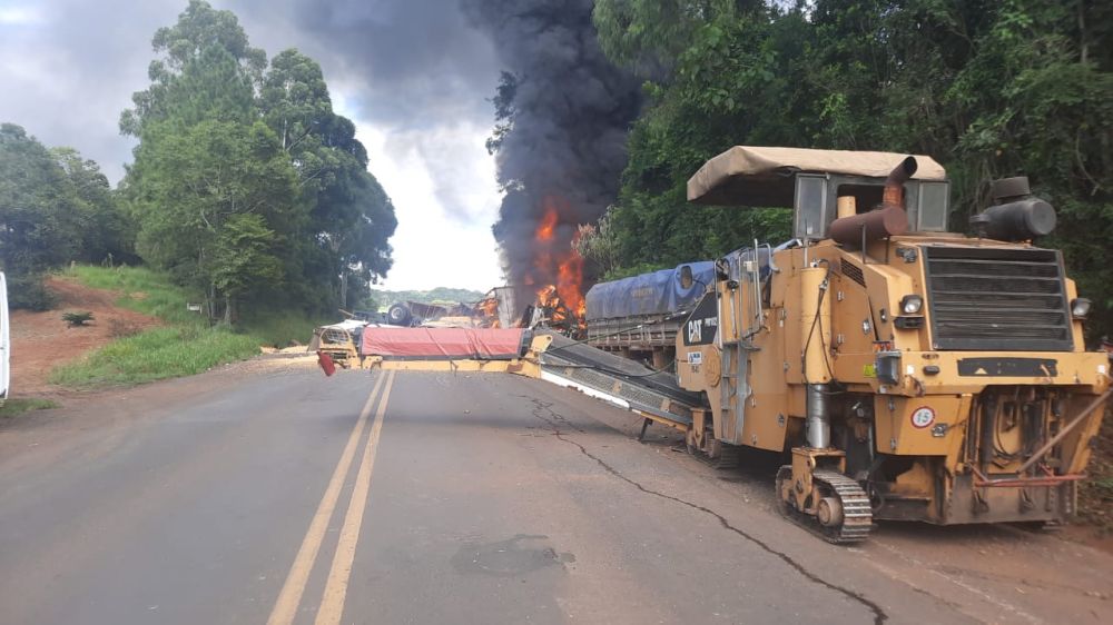 Um grave acidente foi registrado na PR-483, entre Francisco Beltrão e Ampére, no Sudoeste do Estado, na manhã desta segunda-feira (22). Segundo as primeiras informações, a ocorrência envolveu três caminhões, um carro e uma máquina utilizada na manutenção de rodovias.