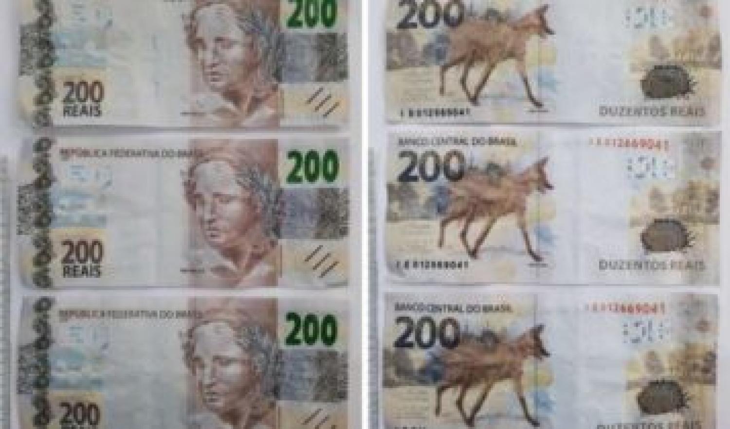 No local foi constatado que um homem teria ido no estabelecimento comercial pagar uma conta no valor de R$ 1.600,00, entregando para a operadora do caixa sete notas de R$ 200,00 totalizando R$ 1.400,00 em notas falsificadas.