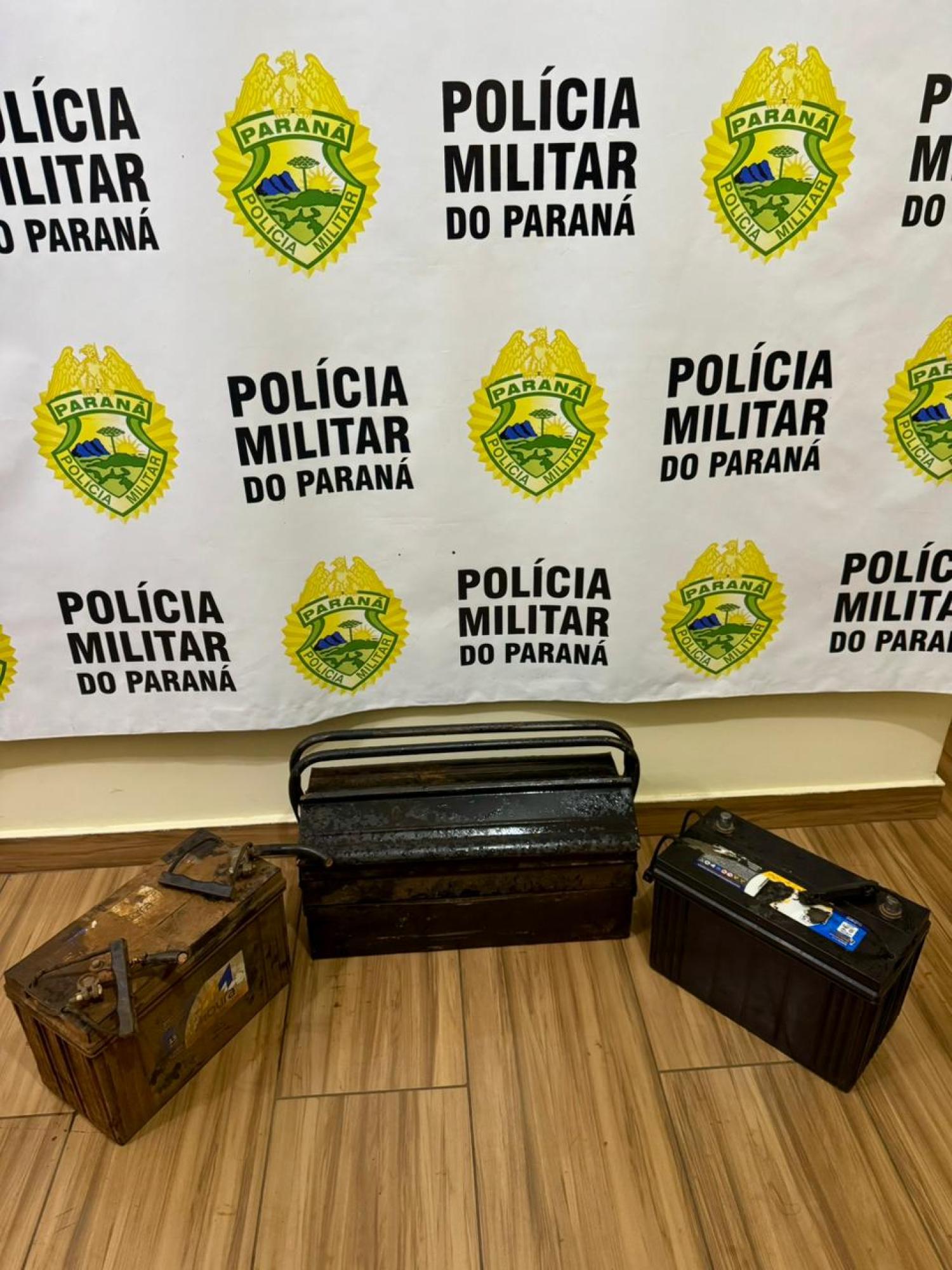 Diante disso, a equipe deslocou até o local informado pelo abordado, onde foi identificado o morador (45) que confirmou ter adquirido a bateria por R$70,00. Na sequência, foi deslocado ao segundo endereço, onde foi identificado o indivíduo (39) e localizada a outra bateria. O acusado do furto também indicou a localização da caixa de ferramentas que foi apreendida pela equipe.