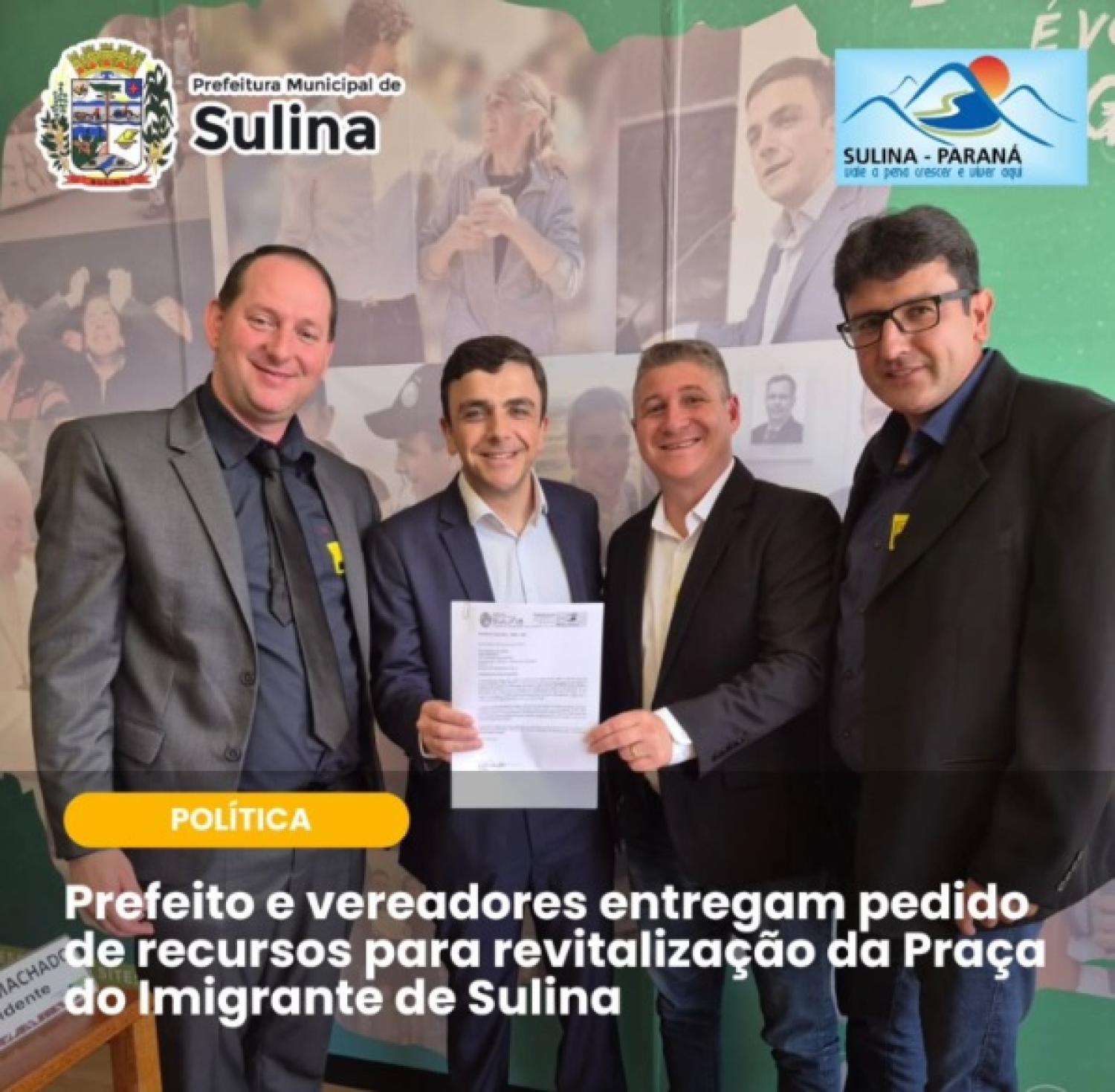 Nesta semana o prefeito de Sulina, Gilberto Rossi, acompanhado dos vereadores Cleiton Chioquetta e Eliel da Silva, estiveram no gabinete do Deputado Federal Aliel Machado em Brasília para a entrega oficial do pedido de recursos destinados à revitalização da Praça do Imigrante, um dos principais símbolos do município.