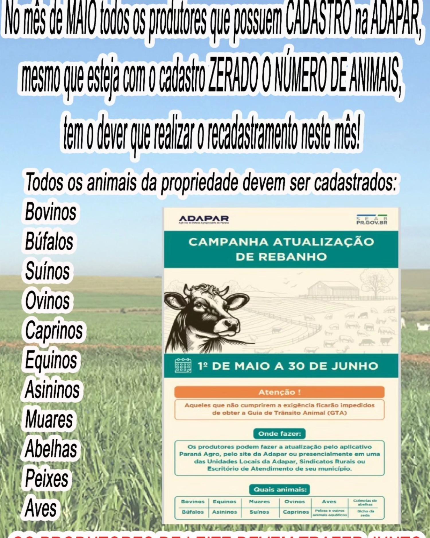 A Campanha de Atualização do Rebanho 2025, promovida pela Agência de Defesa Agropecuária do Paraná (ADAPAR), está em andamento e todos os produtores rurais de Sulina com cadastro ativo devem realizar o recadastramento até o dia 30 de junho. A ação é obrigatória, mesmo para aqueles que não possuem animais atualmente cadastrados.