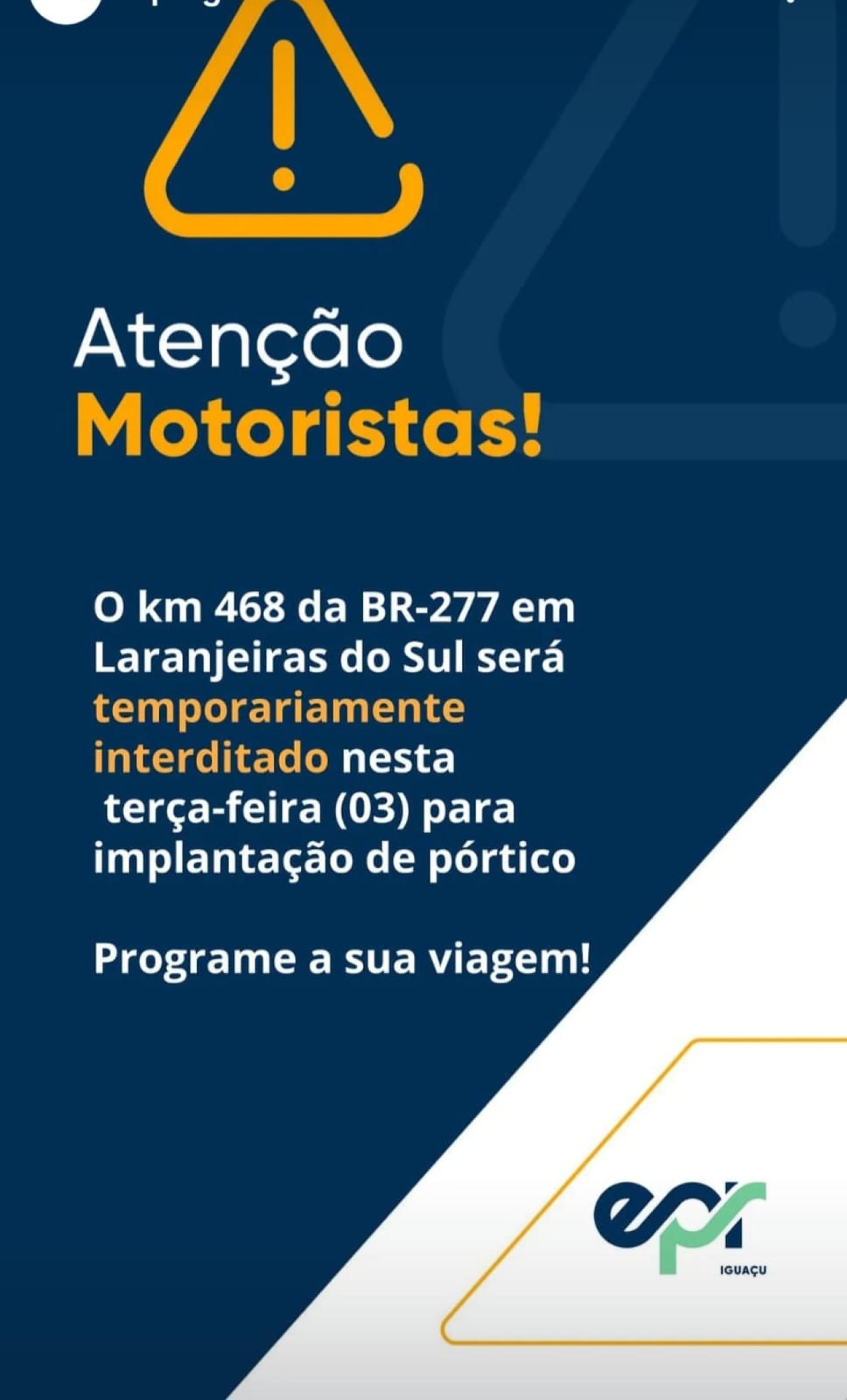A EPR Iguaçu, concessionária responsável pelo Lote 6 das Rodovias Integradas do Paraná, realiza nesta terça-feira (03), operação para implantação de pórtico no km 468, da BR-277, em Laranjeiras do Sul.