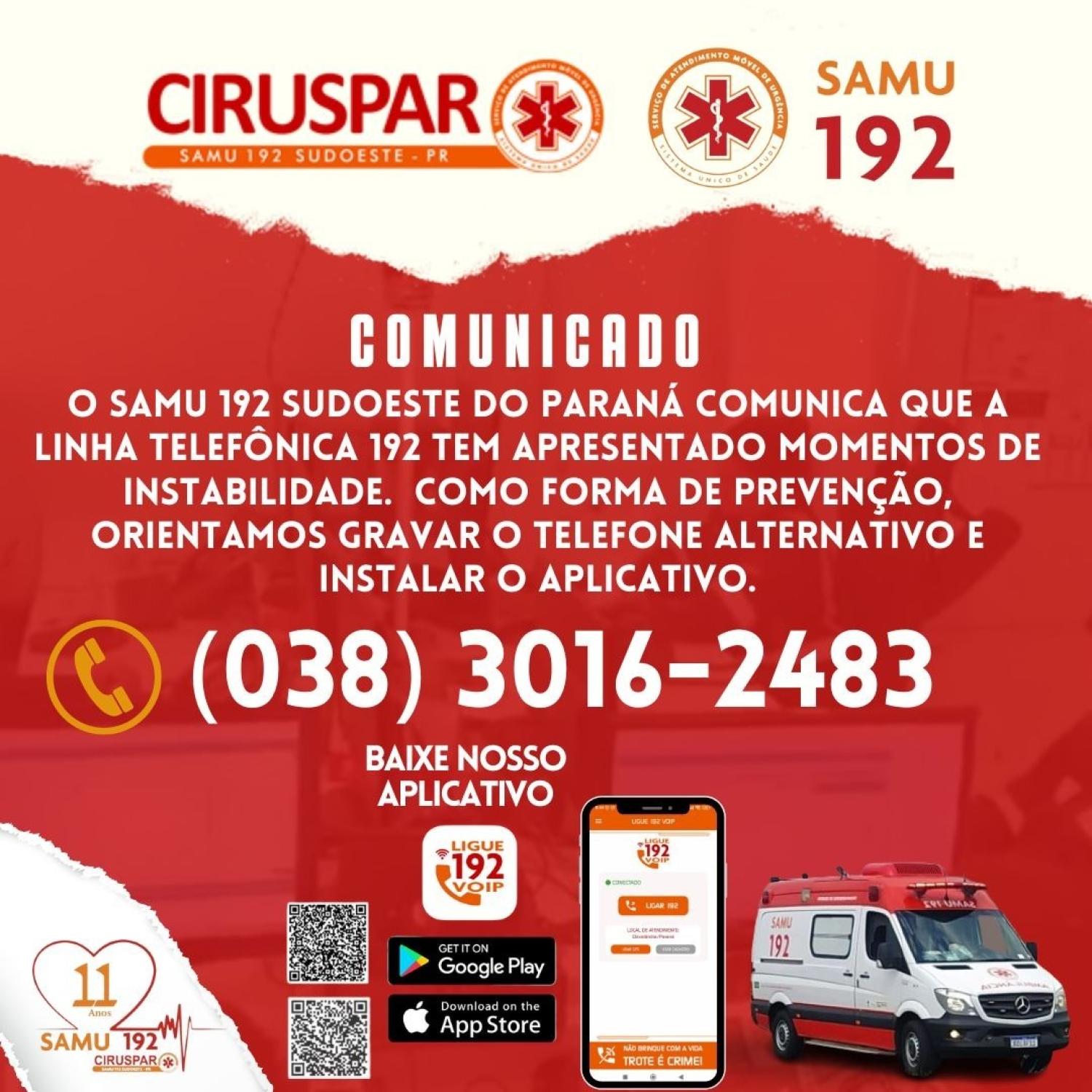 Pato Branco (PR), 4 de julho de 2025 ? O Consórcio CIRUSPAR, gerenciador do SAMU 192 Sudoeste do Paraná, alerta a população sobre instabilidades na linha telefônica 192. Levantamentos de secretarias estaduais de Saúde e registros da Anatel indicam que panes semelhantes ocorreram, nos últimos 12 meses, em pelo menos cinco estados (PR, RJ, MG, BA e RS), em geral relacionadas a falhas na infraestrutura da operadora responsável pela rota única do serviço.