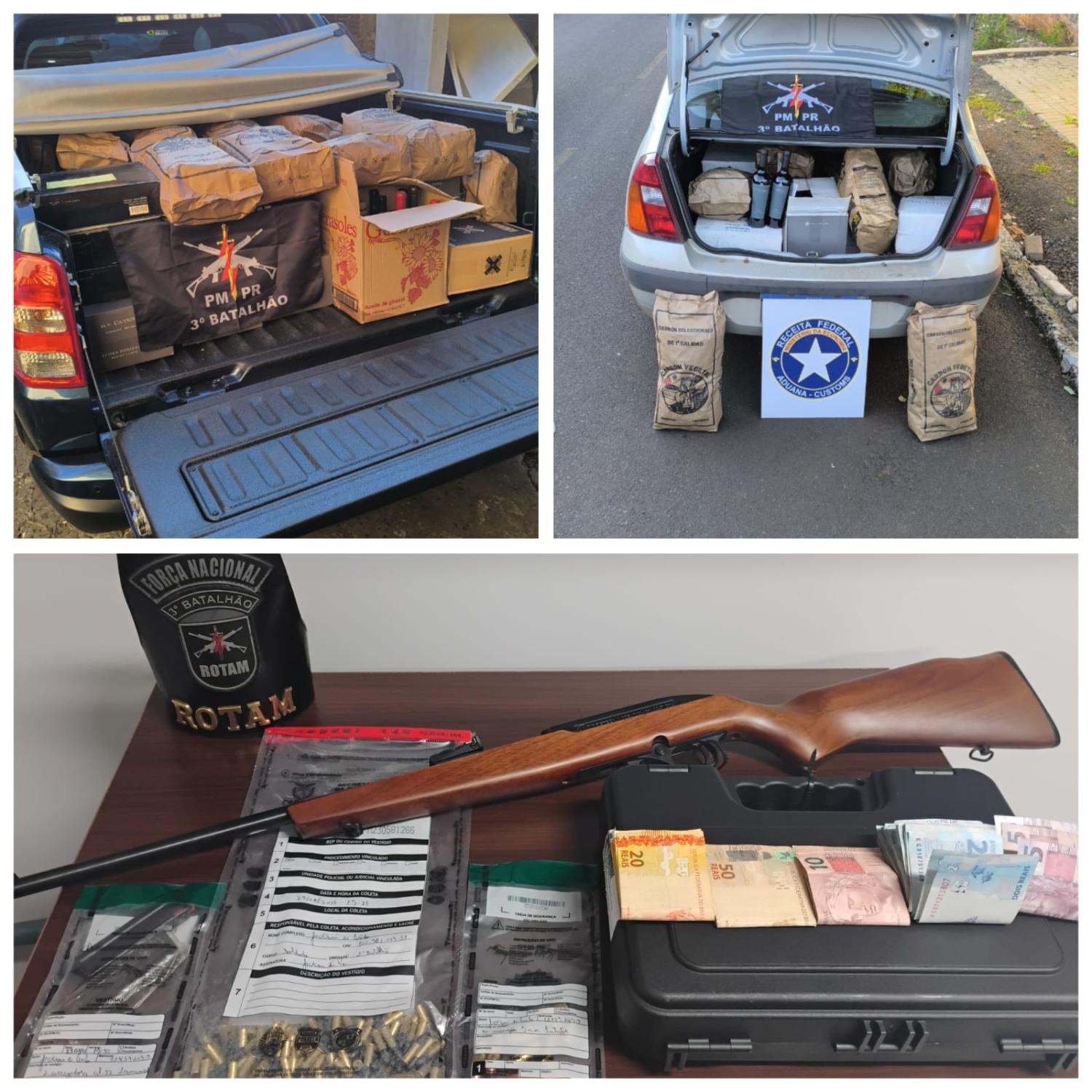 Uma operação conjunta entre a equipe ROTAM da Polícia Militar e agentes da Receita Federal resultou na apreensão de uma grande quantidade de vinhos e carvão estrangeiros, além de armamento e munições, em Pato Branco. A ação ocorreu no bairro Planalto, após monitoramento de um veículo suspeito de envolvimento em descaminho.