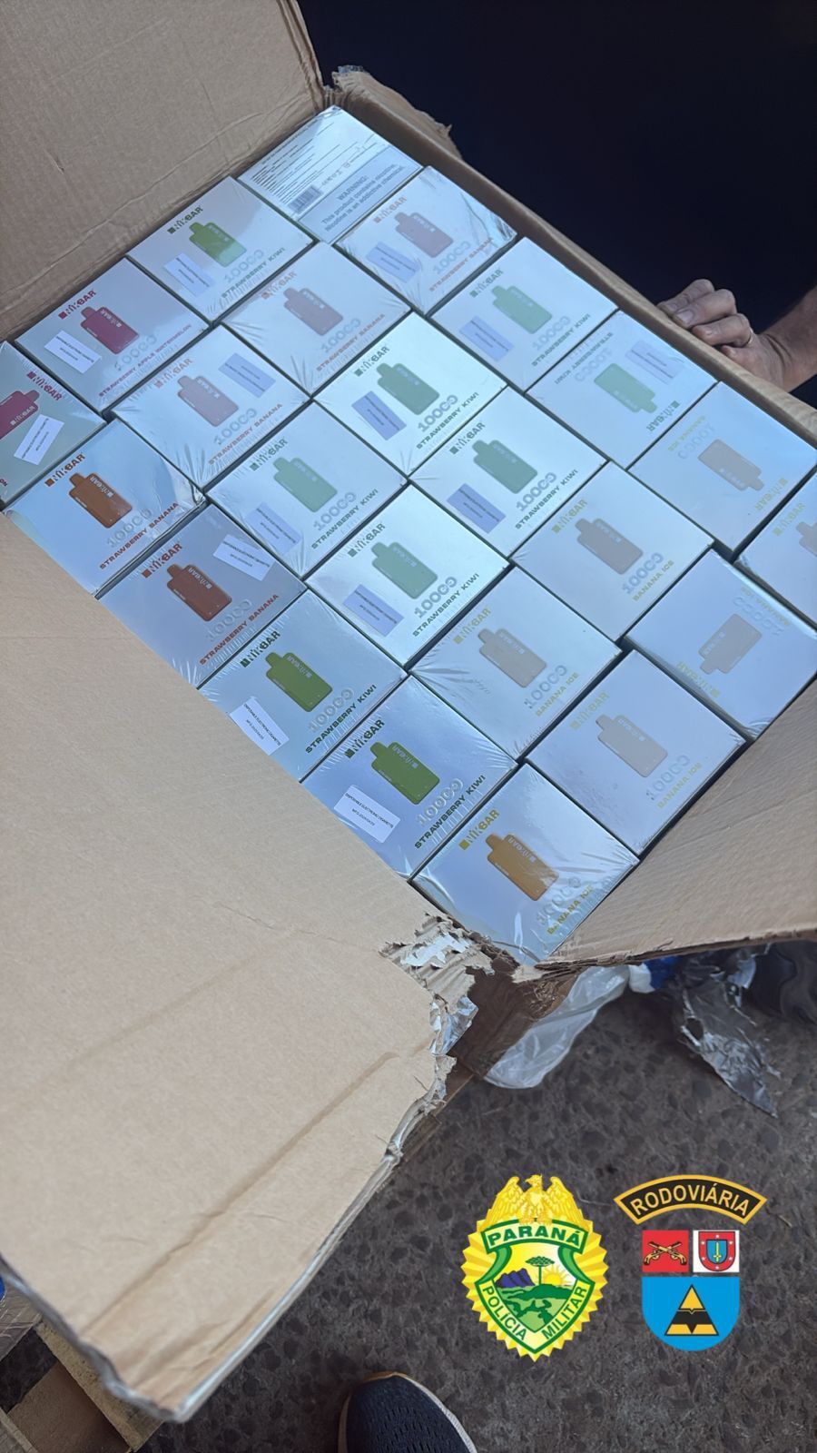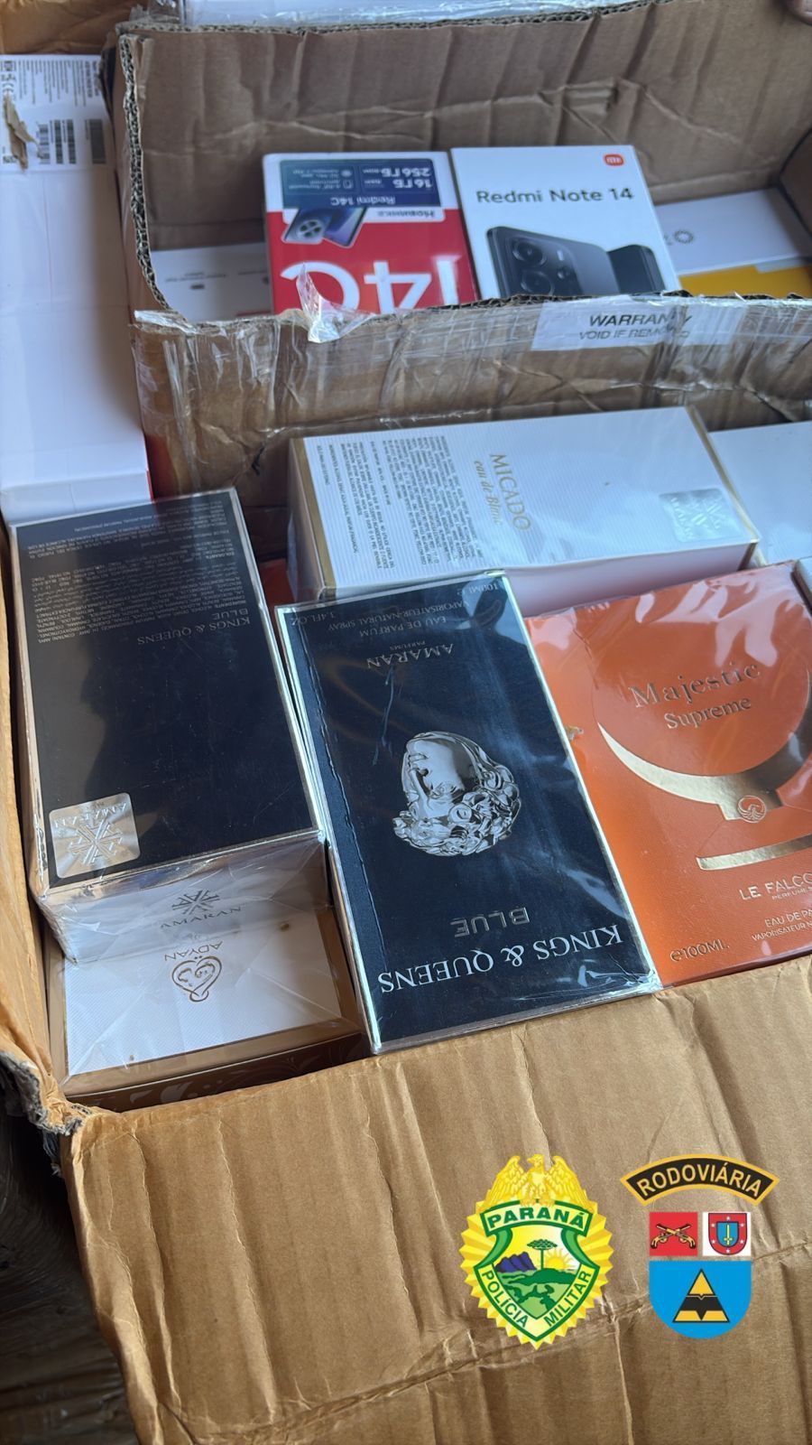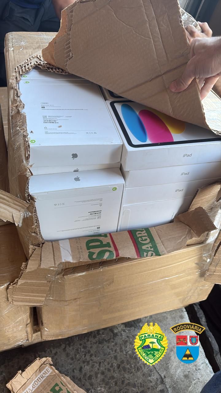 Durante a inspeção, foram constatadas irregularidades na documentação e dificuldades para acesso à carga, pois parte do compartimento baú estava soldada. O veículo foi conduzido até Guarapuava, onde foram localizados cinco pallets contendo eletrônicos de alto valor, como celulares, computadores portáteis, além de itens proibidos no Brasil com cigarros eletrônicos, embalados em filme plástico e sem identificação.