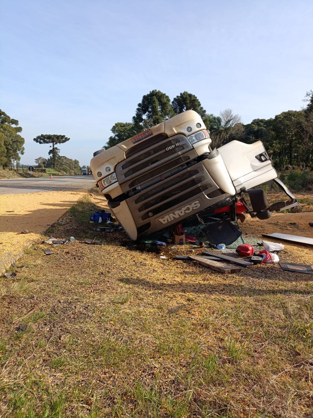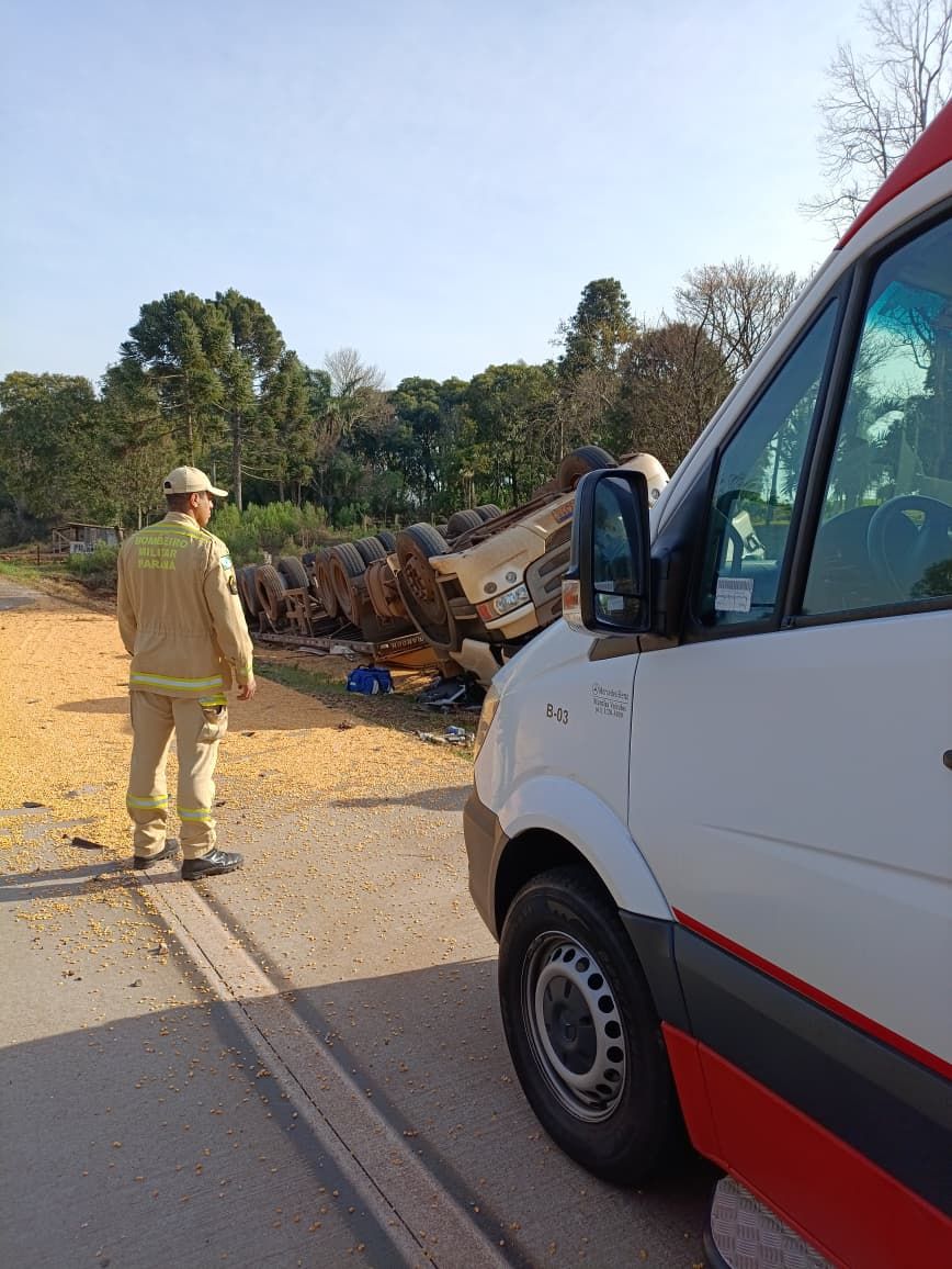 De acordo com informações apuradas no local, um caminhão Scania R-450, placas Mercosul, pertencente a uma empresa de Santa Catarina, atravessou a rodovia e capotou na sequência.