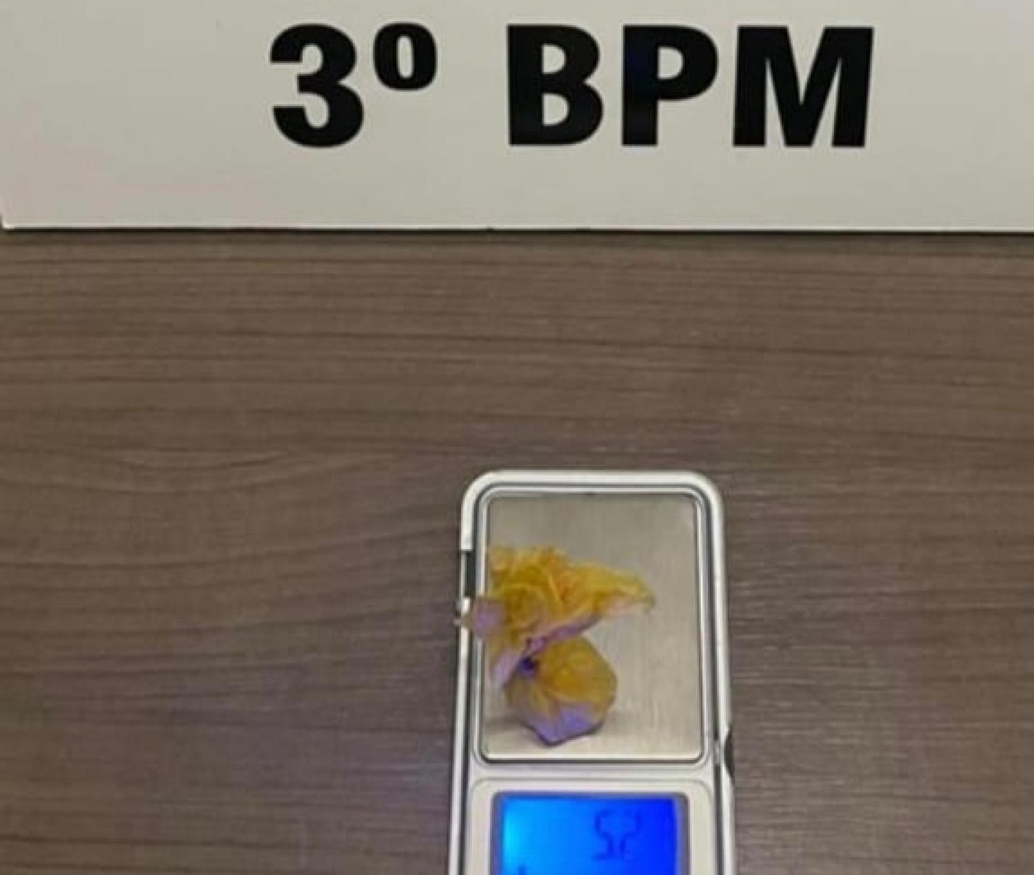 Durante a abordagem a um veículo ocupado por três indivíduos, os policiais encontraram, com um dos passageiros, uma bucha plástica de cor amarela contendo 5,21 gramas de substância análoga à cocaína.