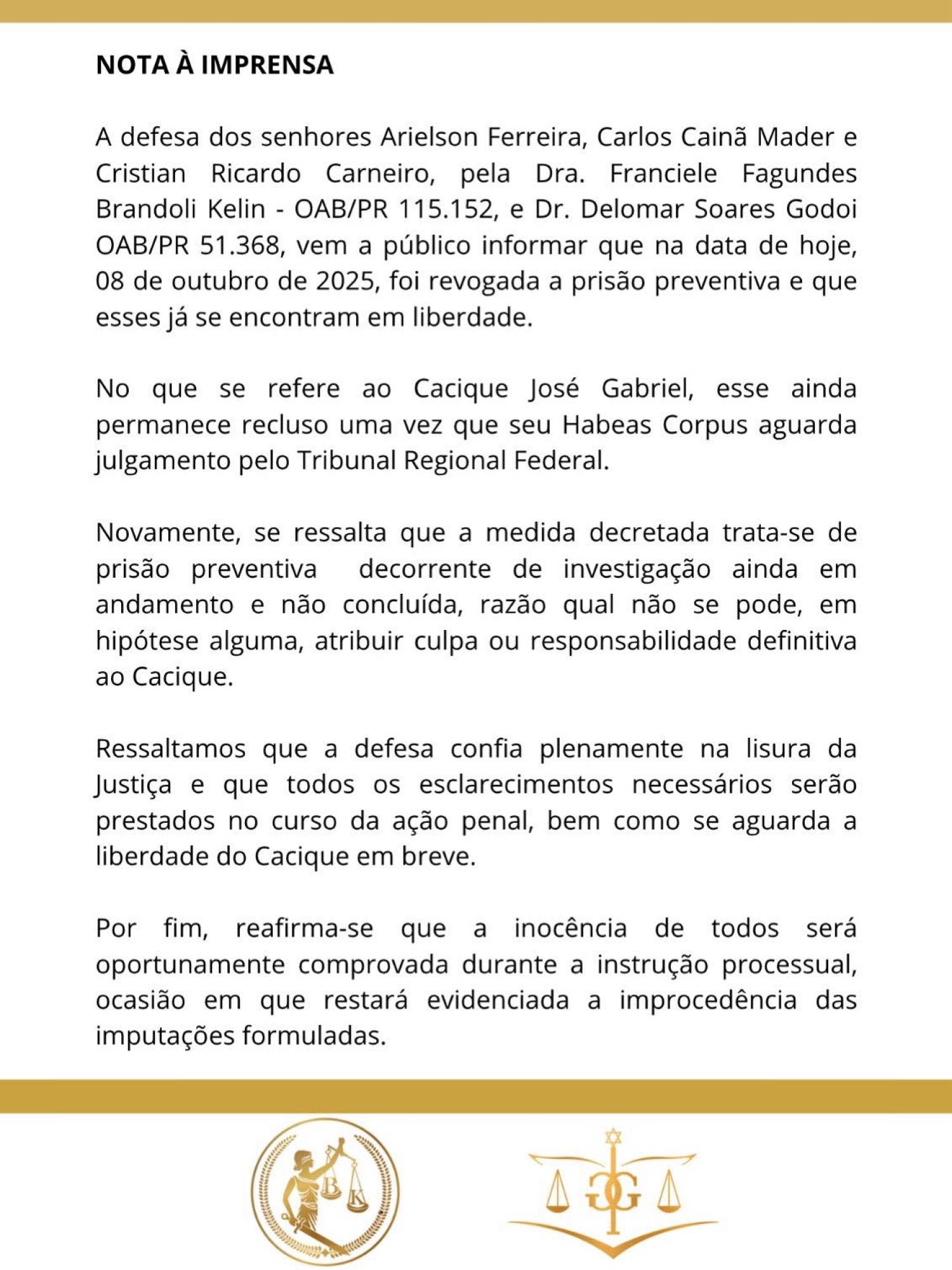 Na tarde de ontem os advogados Franciele Brandoli Kelin e Delomar Soares Godoi, os quais atuam na defesa do Cacique José Carlos Gabriel, do Vice Cacique Cristian Ricardo Carneiro e outros dois indígenas Arielson Ferreira e Carlos Cainã Mader que estão detidos há quase 50 dias na Polícia Federal em Guarapuava, divulgaram nota informando sobre a revogação da prisão do vice cacique e outros dois indígenas.