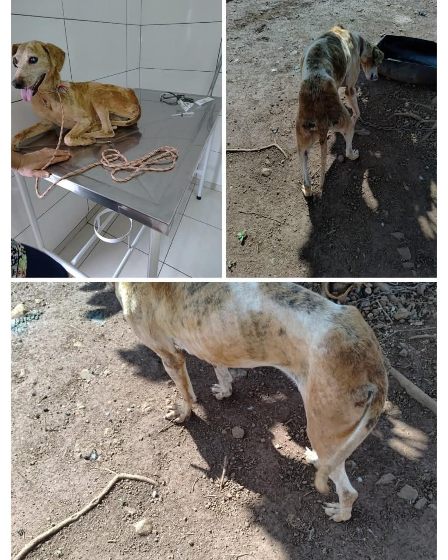 A equipe foi acionada por representantes da ONG, que solicitaram apoio para verificar uma denúncia. No local, os policiais encontraram três cachorros sem raça definida ? dois machos e uma fêmea. A cadela, foco da denúncia, estava amarrada a uma árvore, sem acesso a água, comida ou abrigo, apresentando ferimentos e sinais de desnutrição.