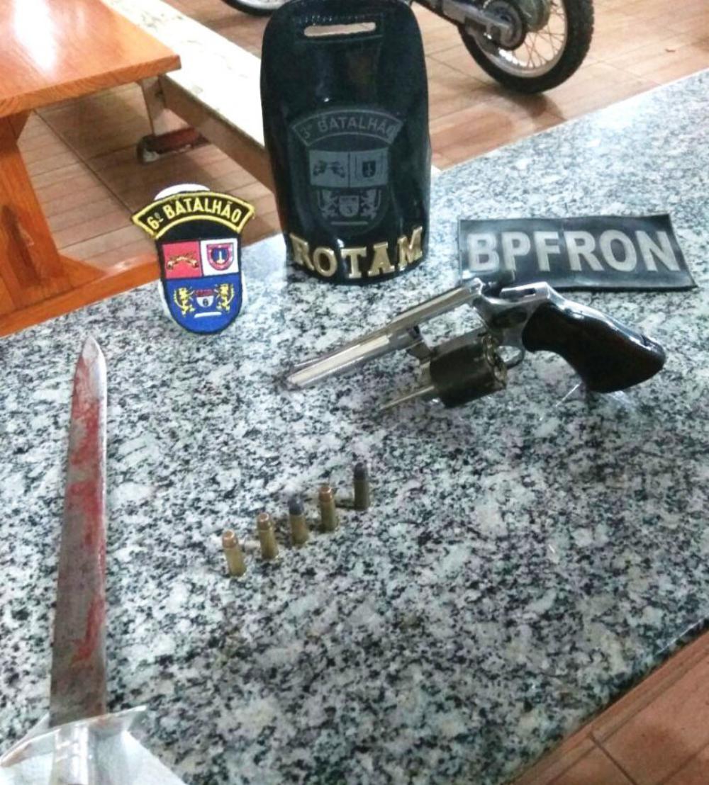 No domingo (19), por volta das 19h30min, durante operação conjunta com a polícia militar da 2ª Cia e de Queda do Iguaçu, em atendimento a uma ocorrência de homicídio, policiais da ROCAM abordaram um homem, de 48 anos, e localizou um revólver cal. 38, marca Rossi, e uma adaga.