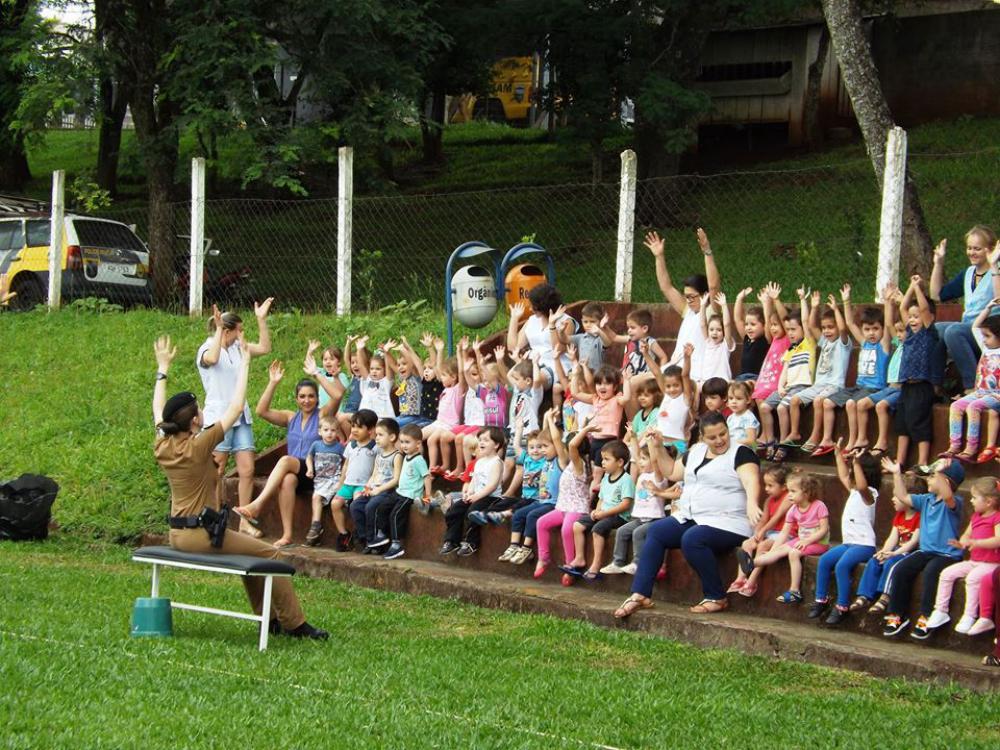 Durante a visita, os pequenos, com idades de 2 a 4 anos, absorveram os ensinamentos em forma de brincadeira. As soldados Francine Herpich e Luciana Savitski dos Santos do PROERD (Programa Educacional de Resistência às Drogas e à Violência) e soldados Thiara Maria Anginoni e Claudete Aparecida da Luz do BPEC (Batalhão de Patrulha Escolar Comunitária) montaram uma pista com várias provas para estímulo à coordenação motora e exercícios físicos. Na pista as crianças andaram na corda, rolaram, fizeram gol e até fugiram de um jacaré, para no final, escolherem um balão da cor favorita!