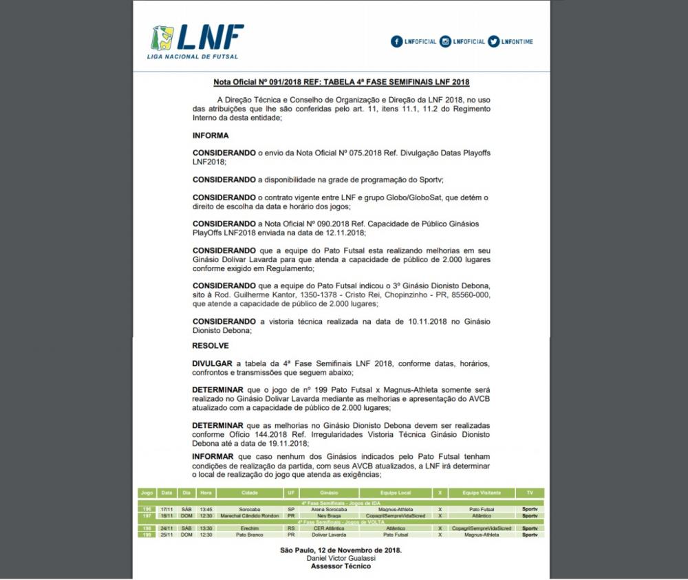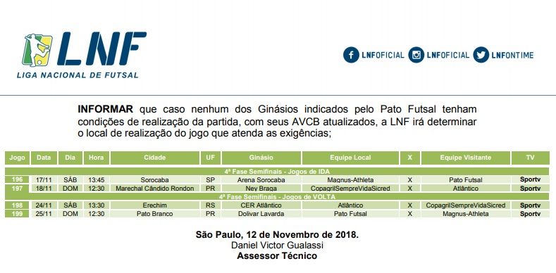 A diretoria do Pato Futsal continua tentando viabilizar a realização do jogo da semifinal da Liga Nacional de Futsal no Ginásio Dolivar Lavarda entre o Pato Futsal e Magnus/Sorocaba. O jogo está previsto para acontecer no dia 25 de novembro. Como o regulamento prevê que os jogos das semifinais e finais devem ser realizados em local com capacidade superior a 2 mil torcedores, o Ginásio de Pato Branco não se enquadra nesse critério do regulamento, o qual tem capacidade para aproximadamente 1 mil torcedores.