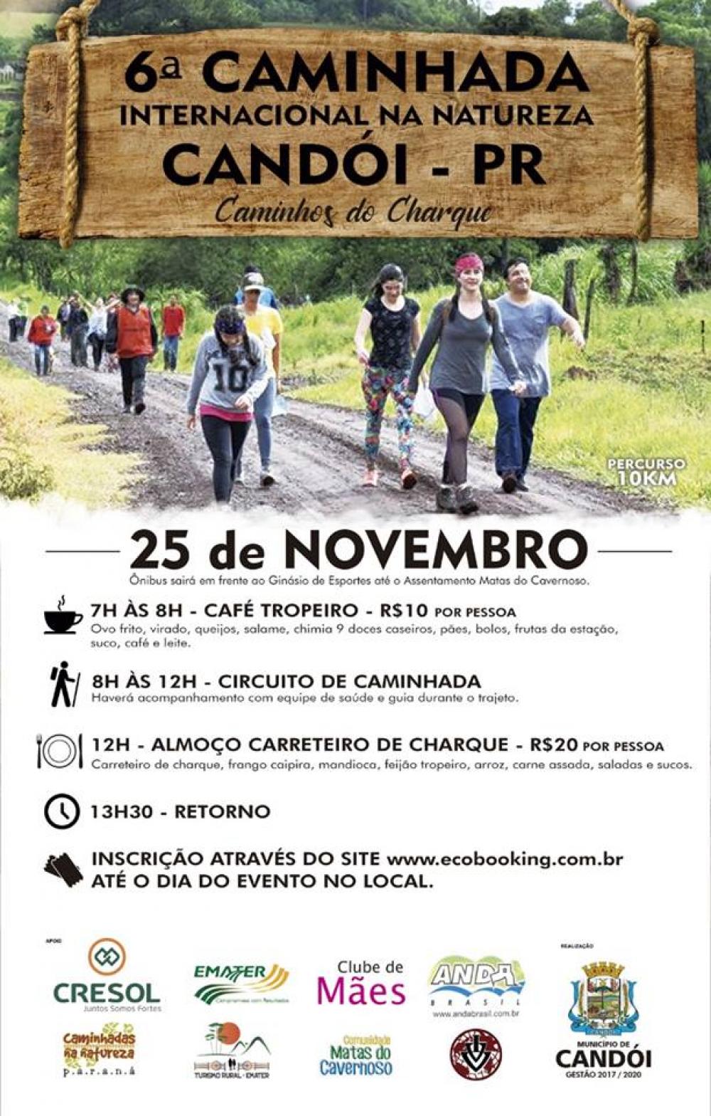 Acontece no próximo domingo, dia 25, no município de Candói, a 6ª Caminhada Internacional na Natureza – Caminhos do Charque. A administração municipal do Candói, convida toda população para participar do evento. O passeio terá início às 7h00 da manhã onde será servido o café, com o custo de R$10,00 por pessoa, às 8h00 está previsto o início do percurso. Às 12h o almoço será servido no valor de R$20,00.