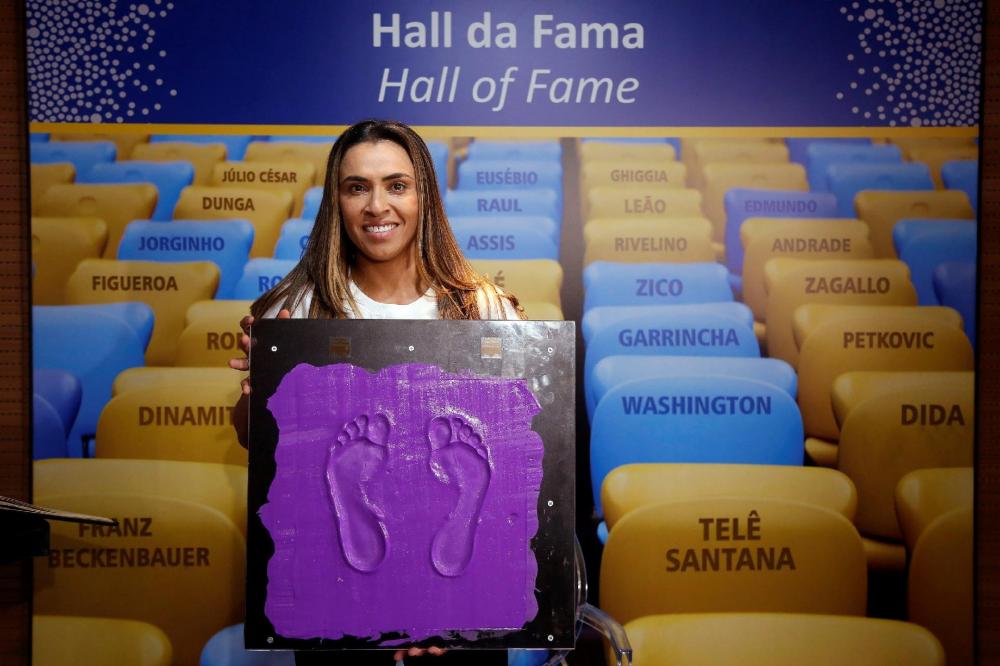 A jogadora de futebol Marta, eleita melhor do mundo seis vezes pela Fifa, é a primeira mulher a entrar para a Calçada da Fama do Maracanã - Fernando Frazão/Agência BrasilMarta é a primeira jogadora de futebol a colocar os pés na Calçada da Fama, que fica exposta no Maracanã, com as marcas de jogadores famosos, como Pelé, Garrincha, Rivelino, Zico e Ghiggia, o atacante uruguaio que fez o Maracanã chorar em 1950, além de outros tantos craques que balançaram as redes no passado.