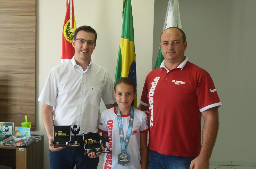 A atleta Mariana Almeida, de 10 anos e faixa preta de taekwondo vem se destacando a nível estadual, o que garantiu a vaga para a fase nacional de competições. Como reconhecimento dos seus resultados expressivos, a atleta recebeu uma homenagem da AESUPAR, como destaque na categoria Taekwondo Feminino. Também, foi recebida pessoalmente pelo Prefeito Álvaro Scolaro, que aproveitou a ocasião para parabeniza-la e incentivá-la ainda mais no esporte.