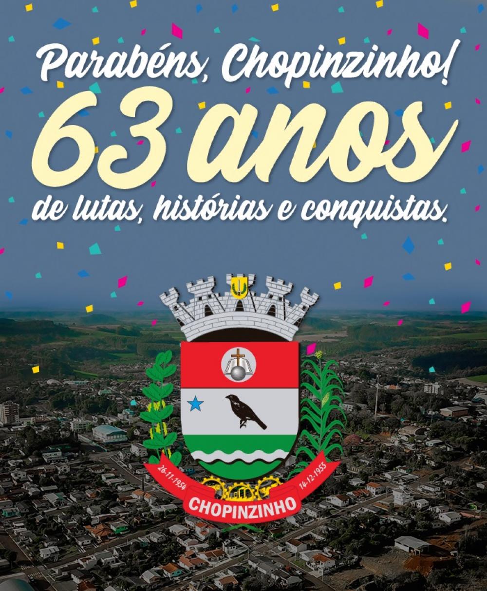O município de Chopinzinho comemora nesta sexta-feira, dia 14, 63 anos de emancipação Político-administrativa. Como parte da programação para comemorar a data, aconteceu na noite de ontem um animado baile com a banda San Francisco no Centro de Eventos, com entrada franca. Nesta sexta feira, feriado municipal, está acontecendo a 3ª Festa do prato típico do franco com polenta e codorna. O evento está acontecendo no Ginásio de Esportes do Bairro Cristo Rei.