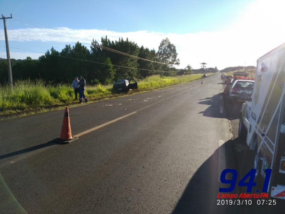 O acidente aconteceu na manhã deste domingo (10) e envolveu um VW/Gol com placas de Rio Bonito do Iguaçu, o qual trafegava em direção à Rio Bonito e um GM/Kadet com placas de Laranjeiras do Sul que trafegava no sentido contrário.