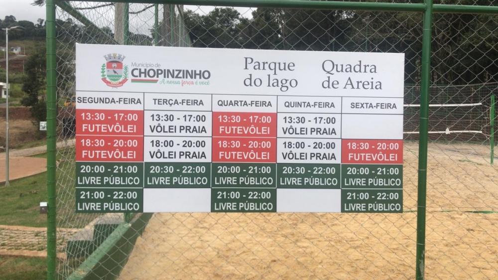 Também, devido a movimentação na quadra de areia, a partir de agora será organizado os horários de uso. Na segunda, quarta e sexta-feira, as quadras serão voltadas ao futevôlei. Já nas terças e quintas-feiras, para o vôlei, com os finais de semana de uso livre. A partir de agora, além do uso normal da comunidade, foi disponibilizado professores para dar aula das duas modalidades, tanto para quem quer aprender quanto para se aperfeiçoar. O horário limite do uso das quadras é 22 horas. O campo sintético de futebol, quando finalizado, também terá regras de uso.