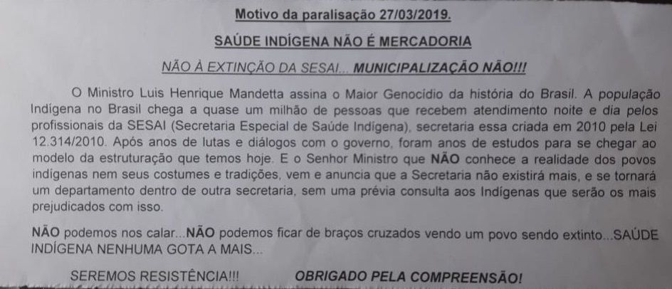 De acordo com a coordenação dos indígenas, a mobilização será o dia todo e é um manifesto contra a municipalização da saúde indígena. A manifestação será pacífica, onde os índios pretendem liberar a rodovia de hora em hora para a passagem de todos os veículos. Ambulâncias e carros de emergências terão a passagem livre a qualquer momento.