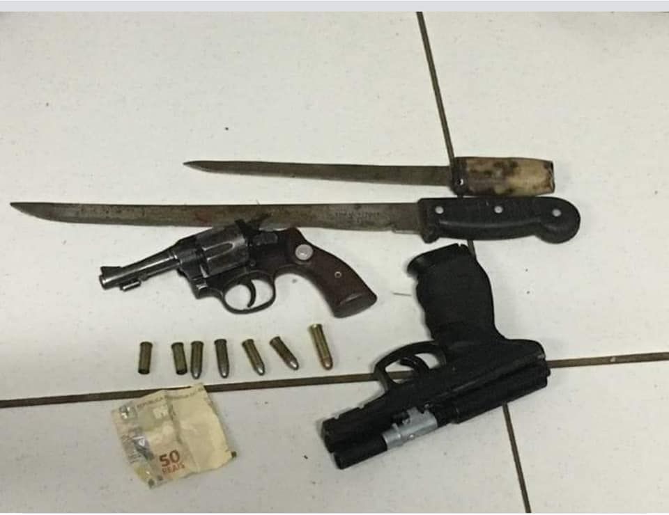 Com Célio foram encontradas duas armas, um revólver calibre 32 e uma pistola Air Sofl. No carro foram achados vários objetos, entre eles um punhal e um facão. A nossa reportagem assim que foi comunicada sobre troca de tiros foi até a sede do Pelotão da PM. Em conversa com os policias recebemos a informação que o indivíduo antes da ocorrência teria entrado em uma residência e agredido um morador com um facão. A vítima contou a PM que foi ameaçada e agredida, tendo vários ferimentos na cabeça, especialmente no rosto. A PM também já tinha conhecimento que dias atrás Celio agrediu um morador no mesmo bairro com coronhadas de revolver e na sequencia fugiu.