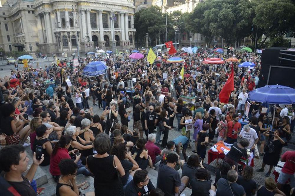 Manifestantes fazem ato contra o regime militar de 1964, em Brasília - José Cruz/Agência Brasil Rio de JaneiroNo Rio de Janeiro, os manifestantes se concentraram a partir das 16h na Cinelândia, no centro. Com cartazes críticos, os manifestantes exibiram fotografias de vítimas do regime militar e relatos de episódios que aconteceram no período. O começo do ato foi marcado por músicas como Pra não dizer que não falei das flores, de Geraldo Vandré, Cálice, Apesar de você e Vai passar, de Chico Buarque.