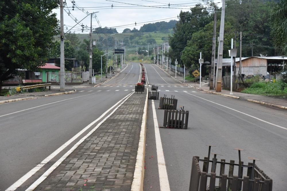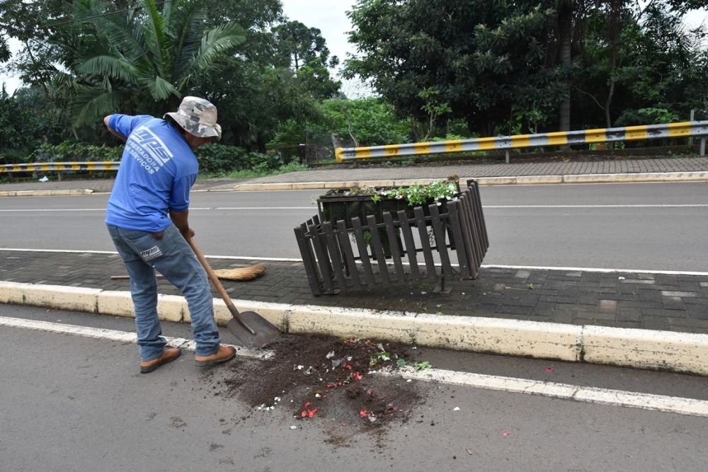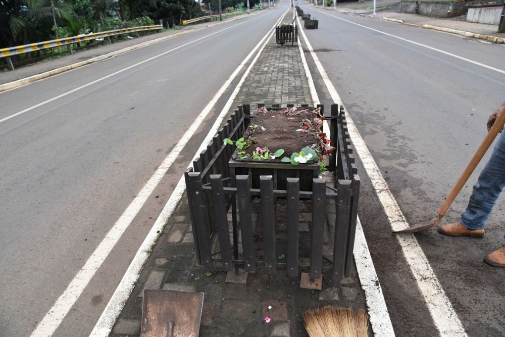 No trecho entre o Centro Comunitário “Padre Leopoldo” e a rua Dionatan Dotti, que dá acesso ao Ginásio, todas as 22 floreiras foram danificadas, viradas e algumas destruídas.