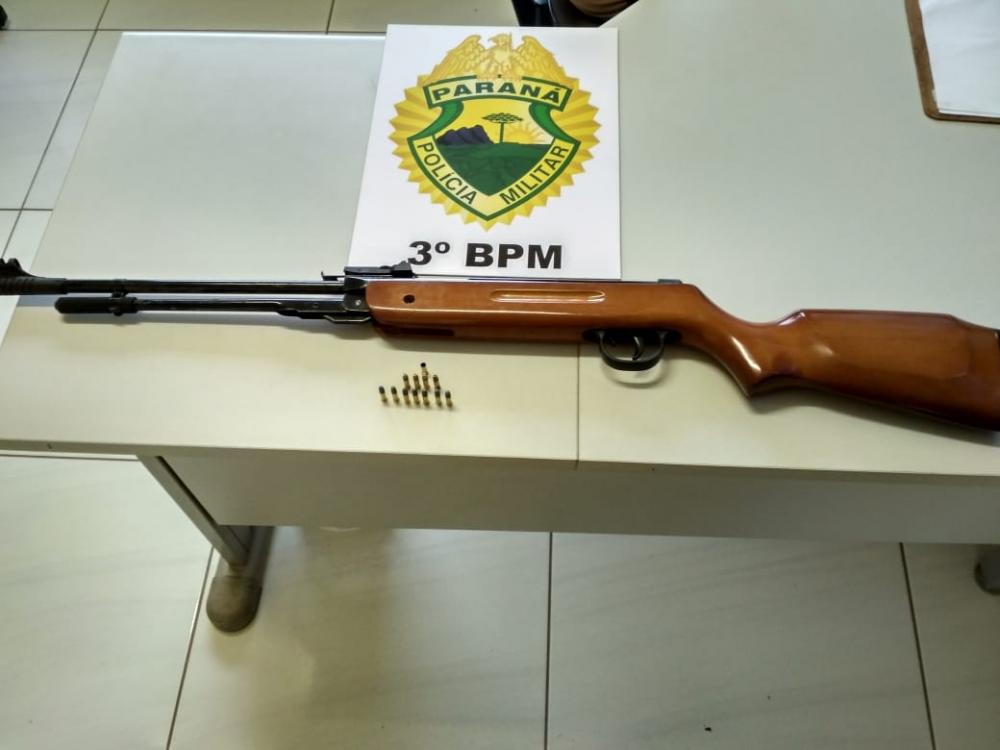 Após ter conhecimento da localização da residência da vítima, a equipe policial deslocou até a comunidade de Alto Mirim na residência do mesmo, sendo que a equipe policial foi abordada por uma senhora, a qual identificou se como mãe da vítima, sendo indagada a mesma sobre o ocorrido e procedência da arma, onde prontamente a senhora levou a equipe policial do lado de baixo da residência em um galpão e mostrou à equipe a arma sendo que a mesma encontrava se caída junto ao chão caracterizando uma espingarda de pressão sem marca e numeração aparente sendo adaptada para usar munição calibre. 22,