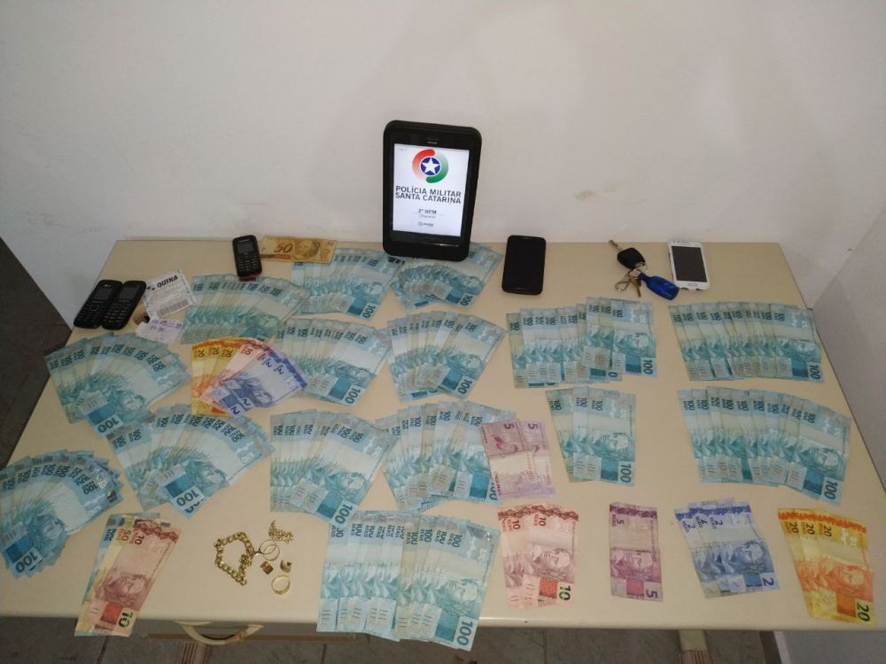 Depois de algumas horas, depois de vários cruzamentos de informações e câmeras de monitoramento, os criminosos foram abordados pela Polícia Militar de Chapecó-SC, sendo submetidos à busca pessoal, tendo sido localizados no veículo aproximadamente R$ 14.700,00 (quatorze mil reais) em dinheiro, diversas joias em ouro (de propriedade da vítima, que haviam sido furtadas de seu veículo), celulares e alguns bilhetes de jogos lotéricos, comprovando a materialidade do crime. Diante dos fatos foi dada voz de prisão a todos os envolvidos pelos crimes de estelionato e furto, pelos quais os contraventores ficarão à disposição da justiça.