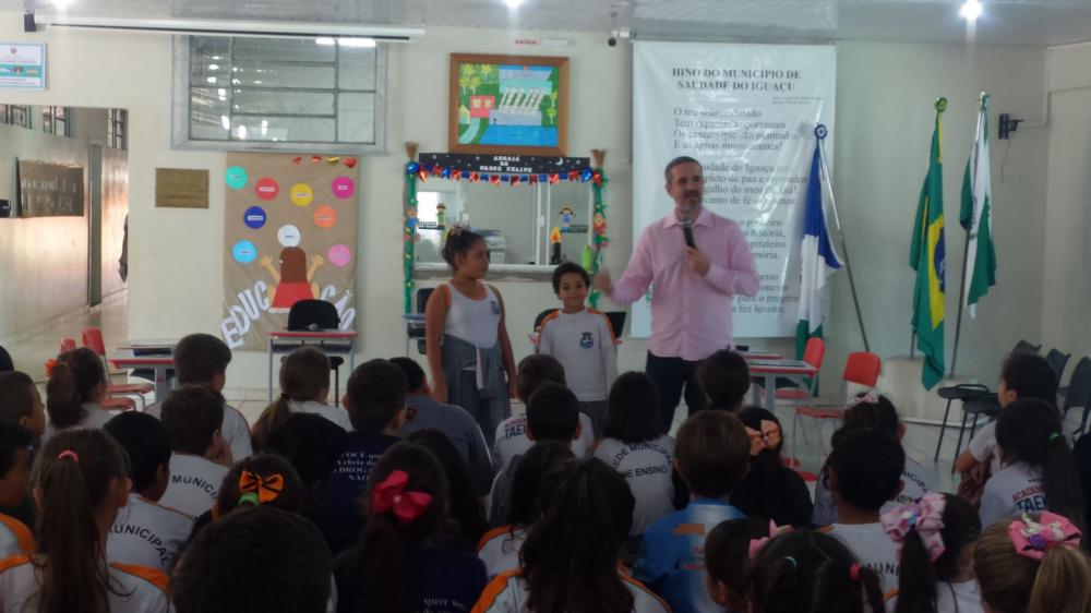 Na última sexta-feira, dia 28 de junho, o juiz da Comarca de São João, Dr. Márcio Trindade Dantas, esteve na Escola Municipal Padre Felipe, o qual proferiu palestra para os 107 alunos do 5º ano das professoras Luciandra Zamarchi, Leticia Zanella, Adrieli Kurpel, Daniela Gnoato e Denise Ferreira.