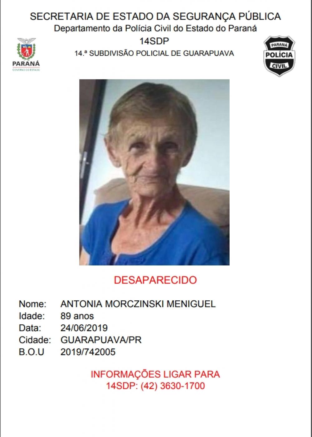 O sumiço de Antônia Morczinski Meniguel, 89 anos, completou uma semana nesta segunda (1), e as buscas foram encerradas. Durante seis dias o Corpo de Bombeiros de Guarapuava e Pato Branco, juntamente com familiares estiveram à procura da senhora.