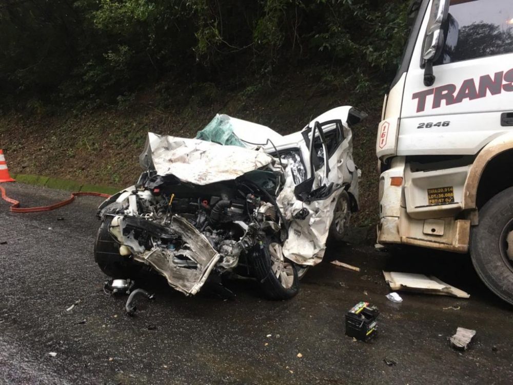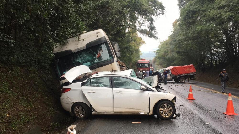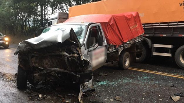 A colisão envolveu um caminhão, um automóvel, placas de Blumenau (SC) e uma caminhonete F.1000, placas de Ampére.