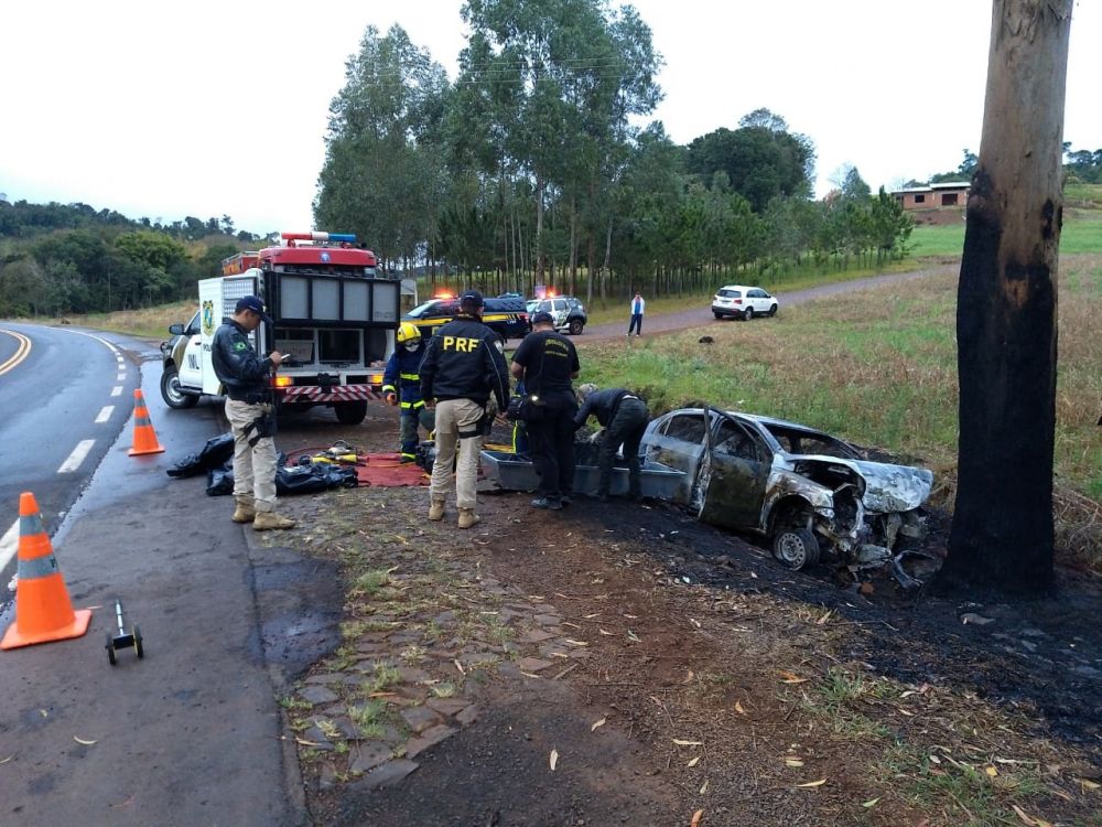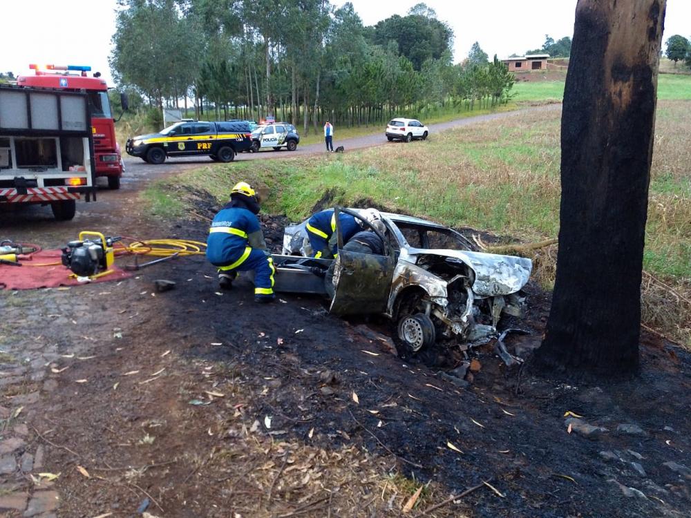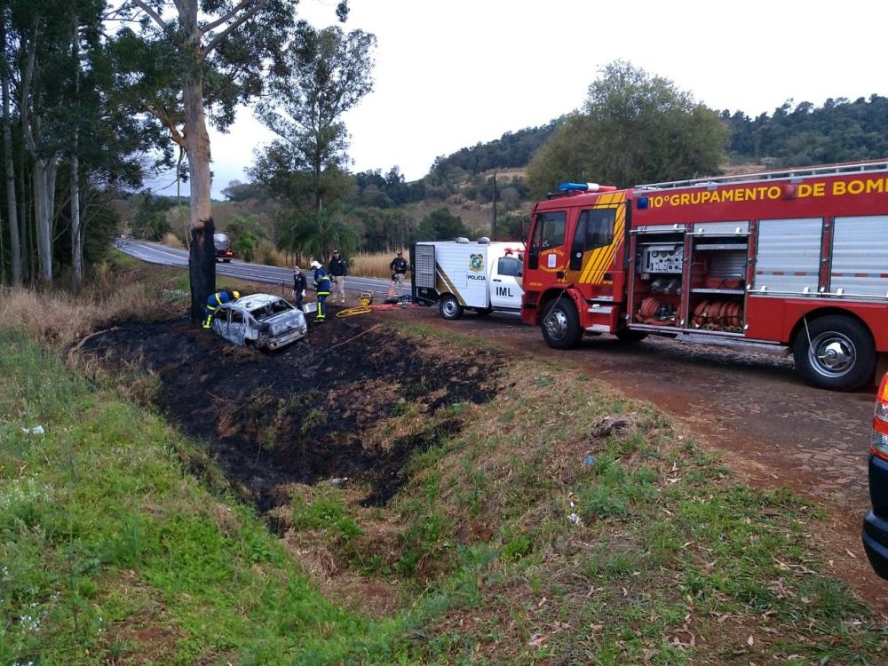 O veículo WV/Voyage, placas NLD8F29, de Planalto, saiu da pista em uma curva e colidiu contra uma árvore às margens da rodovia e incendiou.