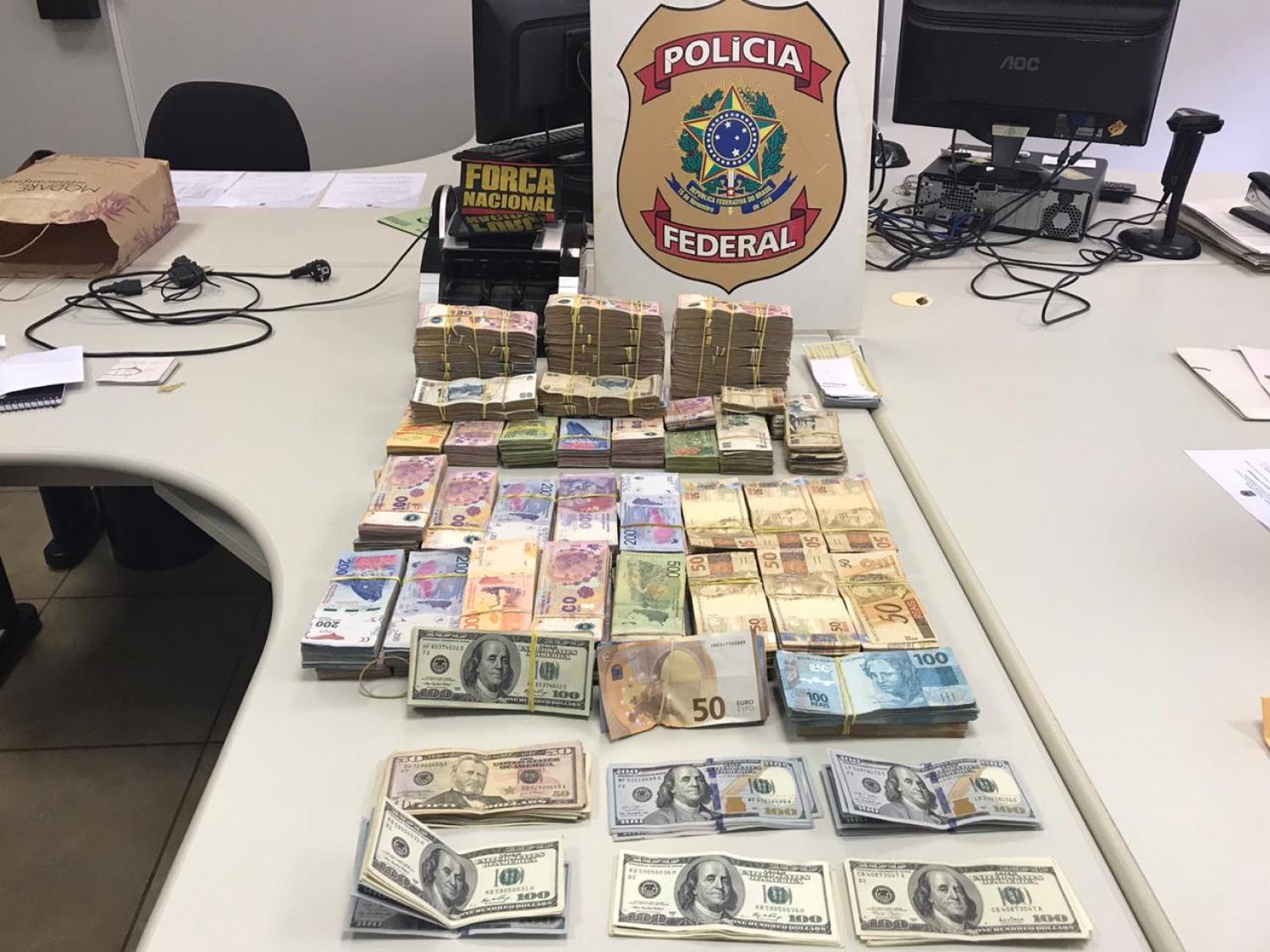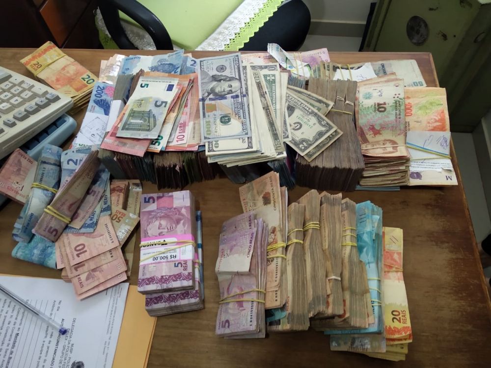 Foram cumpridos 2 Mandados de Busca e Apreensão em residências de empresários daquele município que resultaram na apreensão de 2 máquinas de contar cédulas, 63 cheques bancários com valor total de 89.392,00, 495,00 Euros, 12.011,00 dólares e 1.046.795,00 Pesos Argentinos e 46.700 reais em espécie.