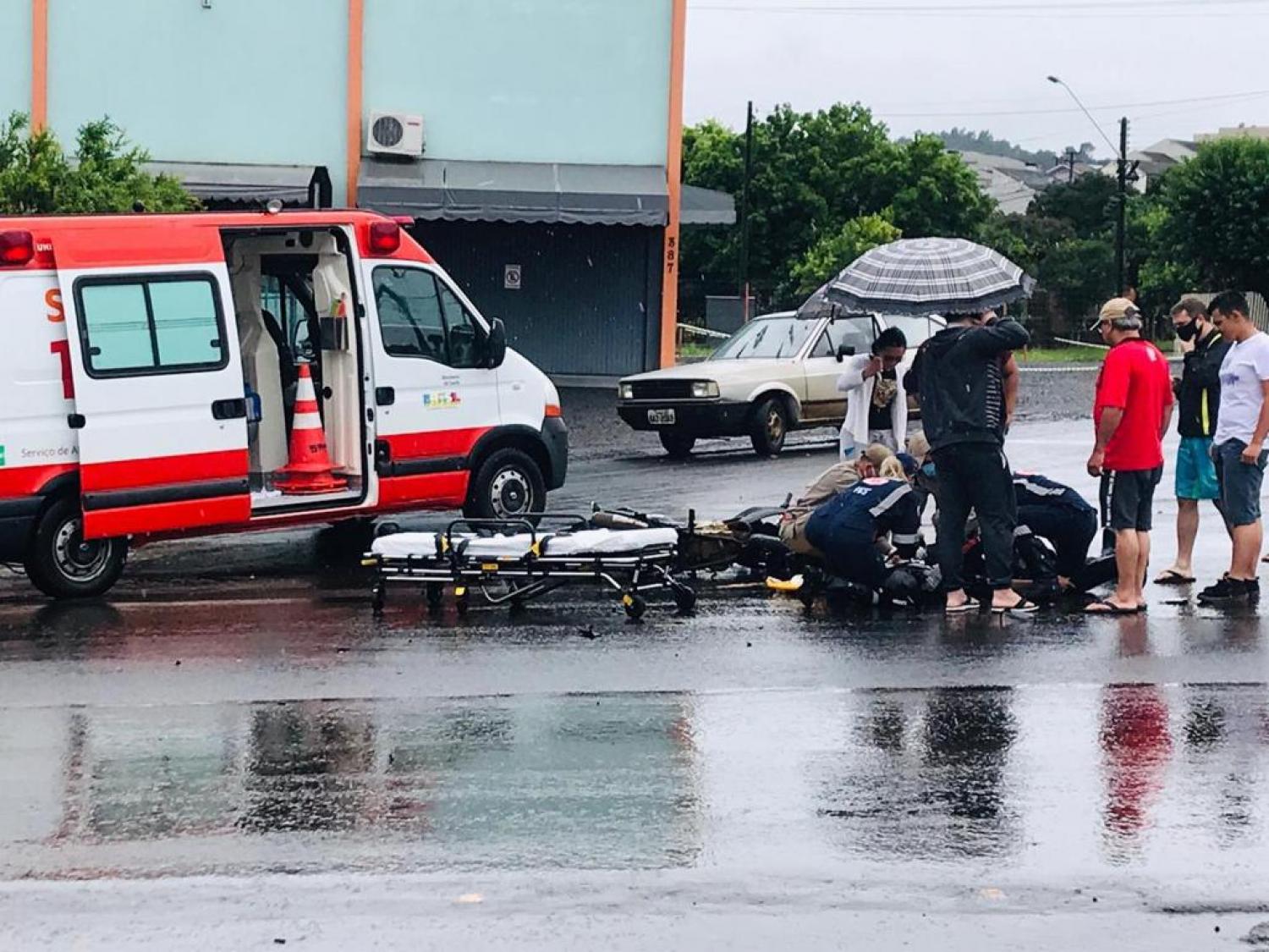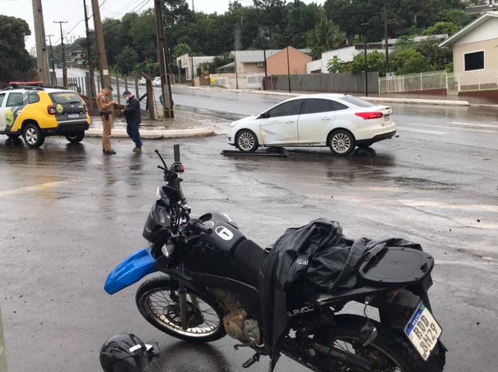 O acidente aconteceu logo após o meio-dia na esquina das ruas Romário Martins e Rosa Stédile, e envolveu um Focus, placa Mercosul, e uma moto Honda Bros 160, placa de Coronel Vivida, de propriedade da empresa de vigilância INVIOLÁVEL.