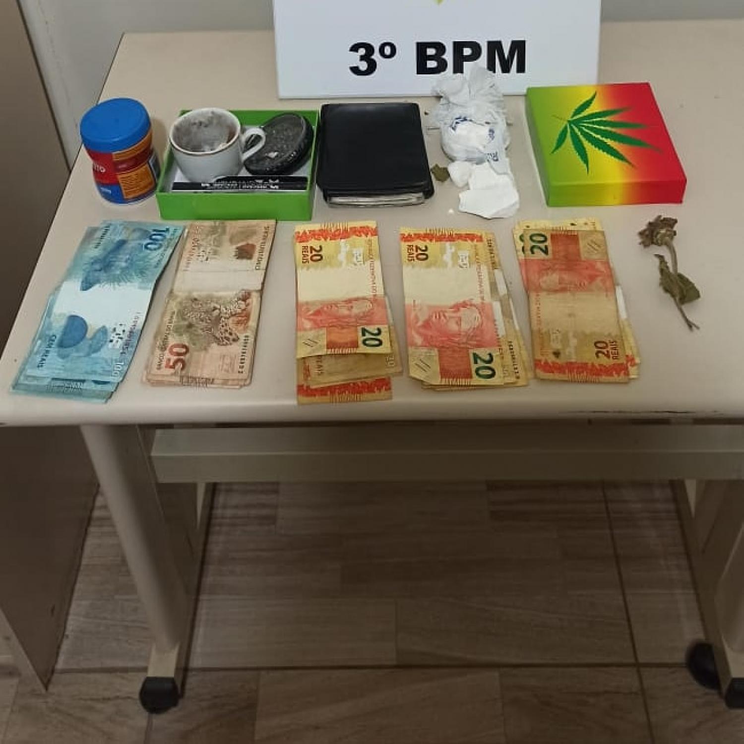 De imediato foi realizada a abordagem dos mesmos, sendo encontrado dentro de uma mochila preta, que estava ao lado de um rapaz, um invólucro plástico com substância análoga a cocaína que pesaram a quantia de 51,7 gramas, e uma bituca de cigarro de maconha que pesou 5 gramas de substância análoga a maconha, um cachimbo com o símbolo de Canabis, uma pistola de pressão marca Gamo F 500, 01 revólver .38 com numeração raspada e 05 munições intactas, um caderno com anotações de valores, e na carteira de um rapaz a quantia de R$ 1.250,00 em espécie.