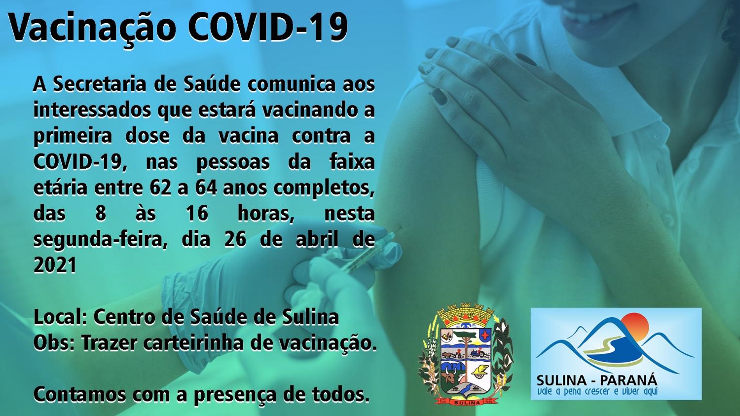 A Secretaria Municipal de Saúde do município de Sulina, estará vacinando na próxima segunda feira, dia 26, com a primeira dose contra a COVID-19, os idosos da faixa etária entre 62 a 64 anos completos.