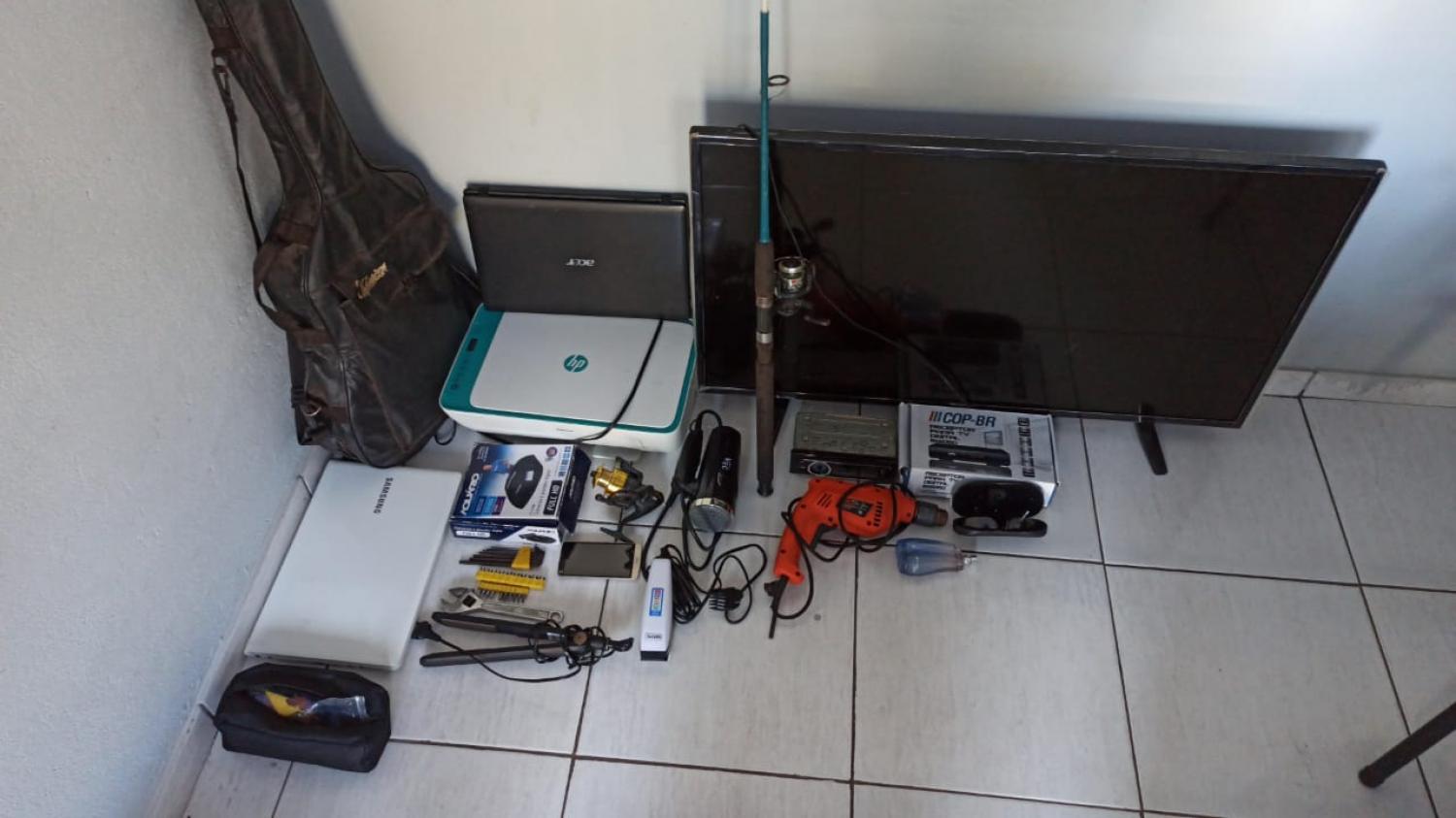 Conforme a PM, no local na Rua Pedro Antônio Casaril, Conjunto Beija Flor, foi encontrado um notebook, uma impressora, um violão, uma furadeira, um celular, dois receptores de TV digital, um secador de cabelo, dois relógios de pulso, 33 peças de semi joias, uma prancha de alisar cabelos, uma máquina de cortar cabelos com acessórios, dois jogos de chaves, um molinete para pesca.