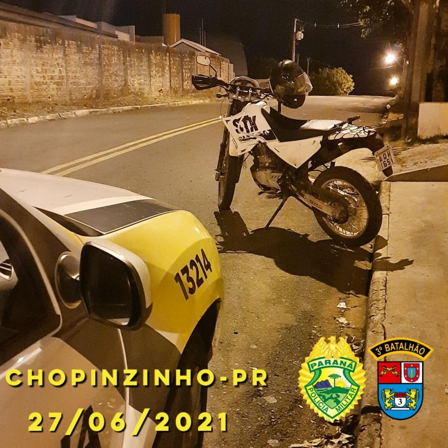 Por volta das 3 horas da madrugada desta terça feira, dia 27, a Polícia Militar de Chopinzinho foi informada que havia uma motocicleta branca, com placas de Chopinzinho, a qual estava abandonada na esquina das ruas Afonso Pena e Joaquin Nunes Farias, a qual possivelmente seria uma motocicleta furtada na data 25/07/2021.