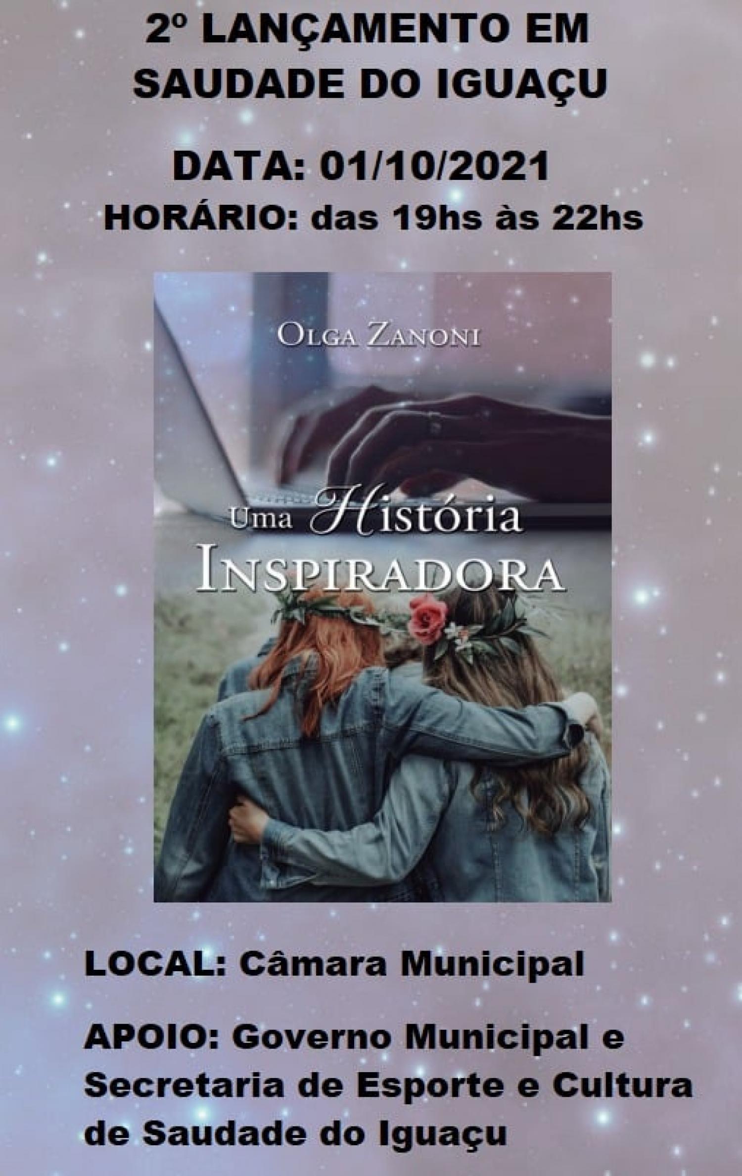 A comunidade saudadense é convidada à participar do Lançamento do livro com a autora de Saudade do Iguaçu Olga Zanoni na Câmara Municipal. Na ocasião, a autora estará contando sobre sua vida e curiosidades sobre o livro.