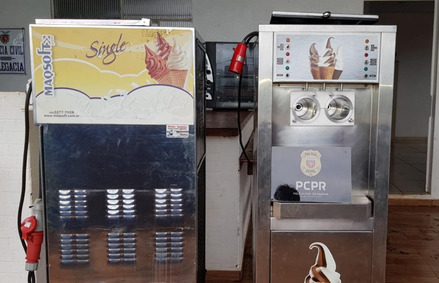 Na hora em que os policiais chegaram na residência, não havia ninguém, porém a mesma estava aberta. Os policias encontraram a máquina de sorvete desse caso de estelionato e também outra máquina que a polícia tenta identificar quem é o proprietário.