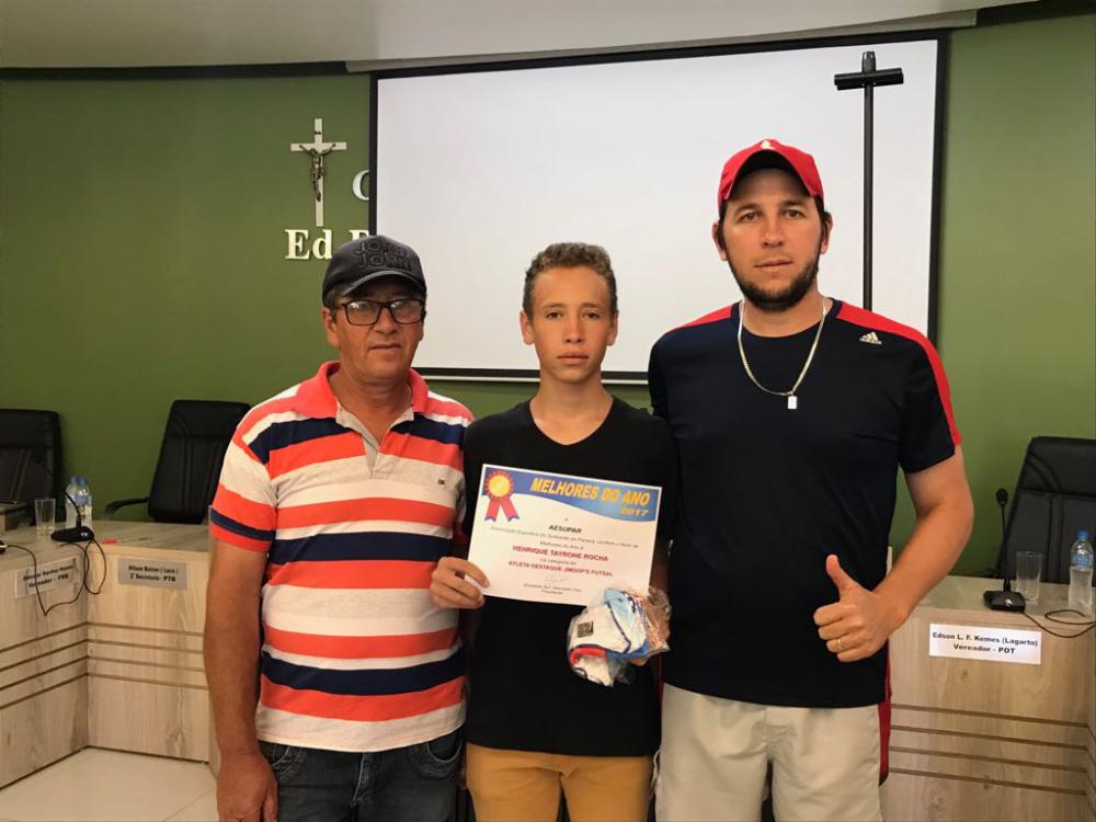 O atleta Henrique Rocha, recebeu no período da manhã desta sexta-feira(02), em Palmas, uma premiação como atleta destaque dos Jogos Infantis 2017. A homenagem foi feita pela AESUPAR-Associação de Esportes do Sudoeste do Paraná, Henrique foi acompanhado pelo seu pai, o técnico Giovani Mello e o coordenador do Departamento de Esportes do município Fernando Misturini.