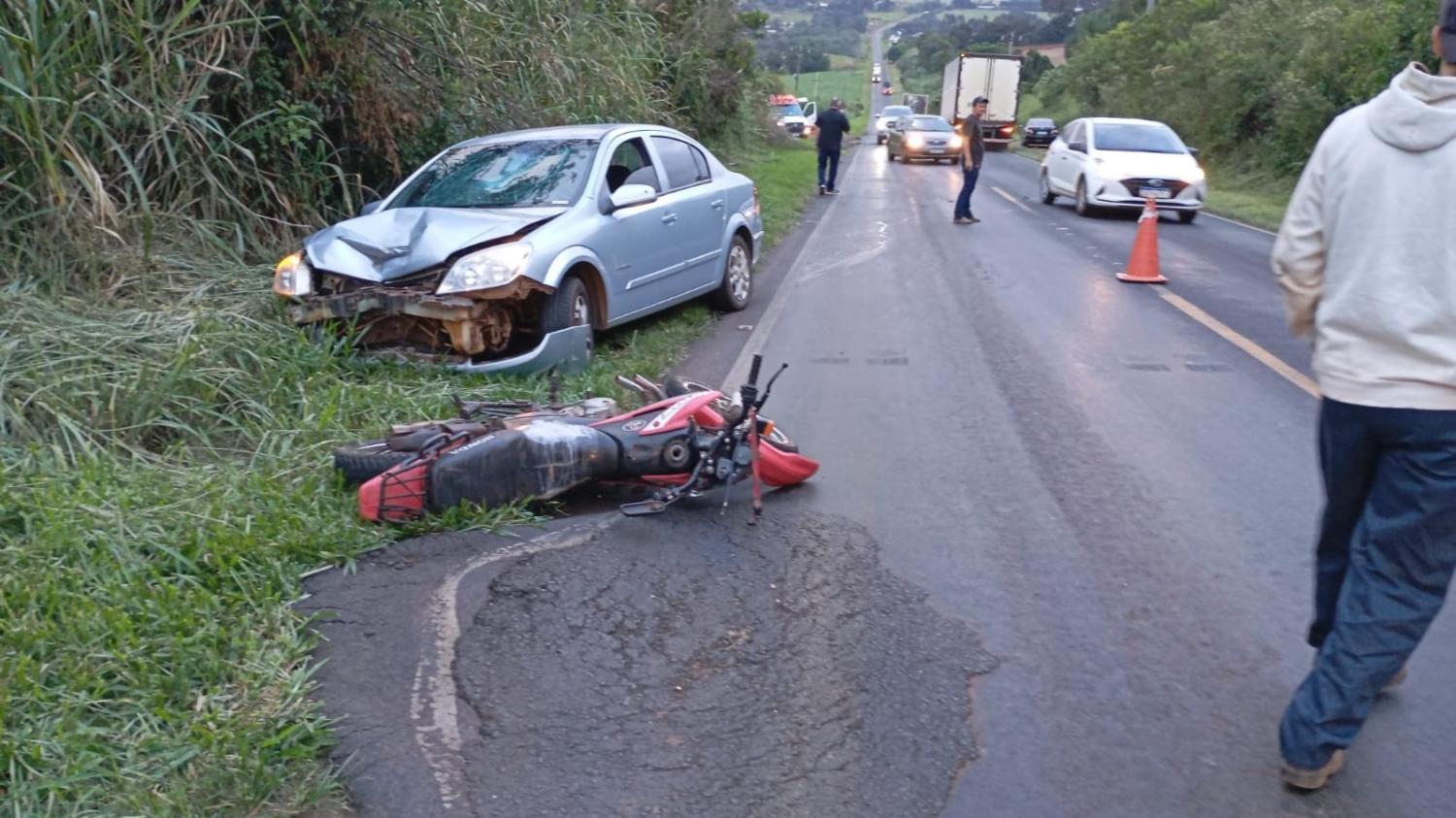 A colisão envolveu uma motocicleta e um veículo Vectra. Com o impacto, o motociclista sofreu ferimentos.