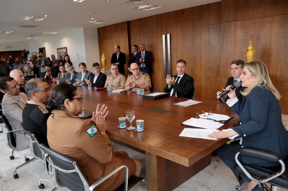 REUNIÃO - Participaram da reunião o diretor da Coordenação da Receita Estadual, Gilberto Calixto; o secretário da Administração Penitenciária, coronel Élio de Oliveira Manoel; o chefe da Casa Militar, coronel Maurício Tortato; o comandante-geral do Corpo de Bombeiros, coronel Fábio Mariano de Oliveira; o controlador Geral do Estado, Carlos Eduardo de Moura; e o presidente da Associação dos Delegados de Polícia do Estado do Paraná, Daniel Prestes Fagundes.