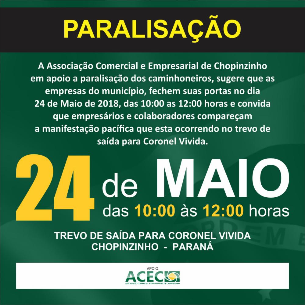 Nas palavras do Presidente da associação Mateus Comelli, a ACEC convida todos os empresários e demais munícipes de Chopinzinho, participem da passeata que sairá as 10 horas, na frente do posto Baranceli com sentido ao trevo onde estão posicionados os grevistas.
