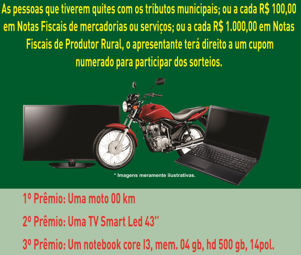 O prefeito municipal Mauro Cenci lembrou que a premiação da campanha neste ano será diferente do que foi no ano passado. Segundo ele, a premiação deste ano terá uma moto 125 cc 0 km, uma TV 43 polegadas e um notebook, os quais serão sorteados no dia 28 de dezembro, juntamente com o sorteio de um carro 0 Km da promoção Natal Premiado que é organizado pela Associação Comercial de Saudade do Iguaçu. Neste ano teremos um número menor de prêmios na campanha, porém, serão de maior valor, como é o caso do carro 0 Km do Natal Premiado e a moto 0 Km, lembrou Mauro.