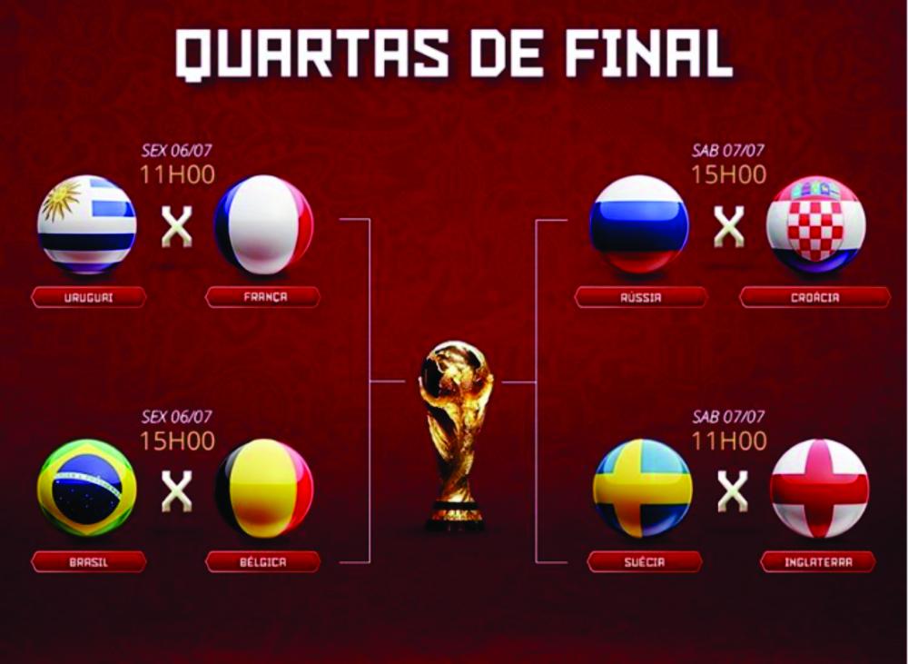 As quartas de final serão disputadas nesta sexta (6) e neste sábado (7). Na sexta jogam Uruguai e França, em Nizhny Novgorod, às 11h. Às 15h, o Brasil enfrenta a Bélgica, em Kazan. No sábado, jogam às 11h, em Samara, Suécia e Inglaterra. Por fim, às 15h, Rússia e Croácia entram em campo em Sochi. As semifinais acontecem na terça e quarta-feira da semana que vem.