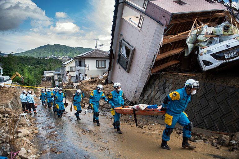 As precipitações recordes que caem desde quinta-feira passada no arquipélago japonês provocaram inundações e deslizamentos de terra, especialmente graves nas cidades de Hiroshima e Ehime, onde o fenômeno meteorológico arrasou milhares de casas e deixou vários povoados completamente isolados.
