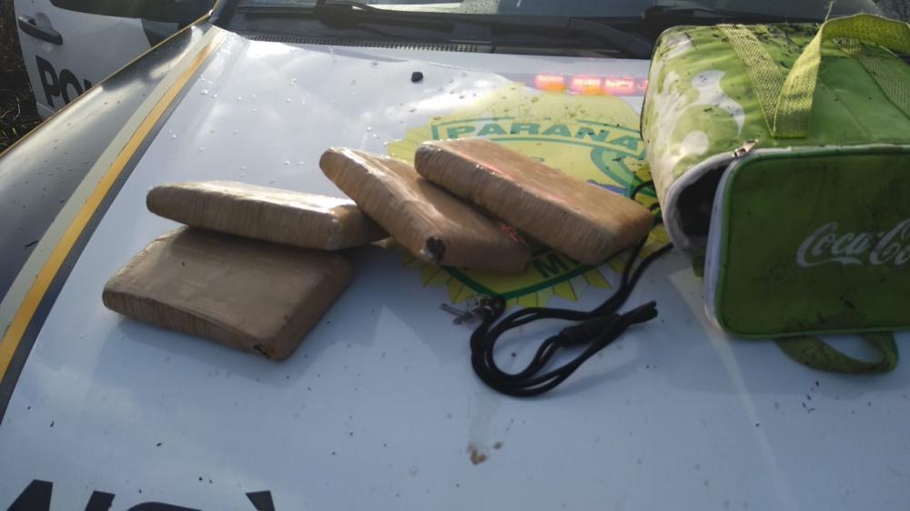 A Equipe policial suspeitou de um veículo que continha três pessoas em seu interior e realizou a abordagem policial. Após seguir o veículo por alguns quilômetros no intuito de encontrar um local com maior segurança para proceder a revista, um dos ocupantes abriu a porta dianteira direita e dispensou às margens da rodovia um invólucro de tamanho médio. Em seguida o veículo estacionou e foi abordado pelos policiais. Os policiais então retornaram alguns metros e apanharam o invólucro que fora dispensado por um dos ocupantes antes da abordagem e constataram que em seu interior havia quatro tabletes de maconha. Um dos abordados assumiu ser o responsável pela droga encontrada e informou que apanhou a droga na cidade de Cascavel (PR) e receberia R$ 1.000,00 (mil reais) para fazer o transporte até a cidade de Curitiba (PR) mais os gastos da viagem. Os outros dois ocupantes são oriundos do estado de SC e informaram estar morando atualmente em Clevelândia a pouco tempo. Foram aprendidos 2,6 Kg de maconha (após pesagem) e o veículo foram levados até a 5ª SDP de Pato Branco para apresentação da situação ao Delegado de Plantão e lavratura do Auto de Prisão em Flagrante Delito pelo crime de Tráfico de Drogas.